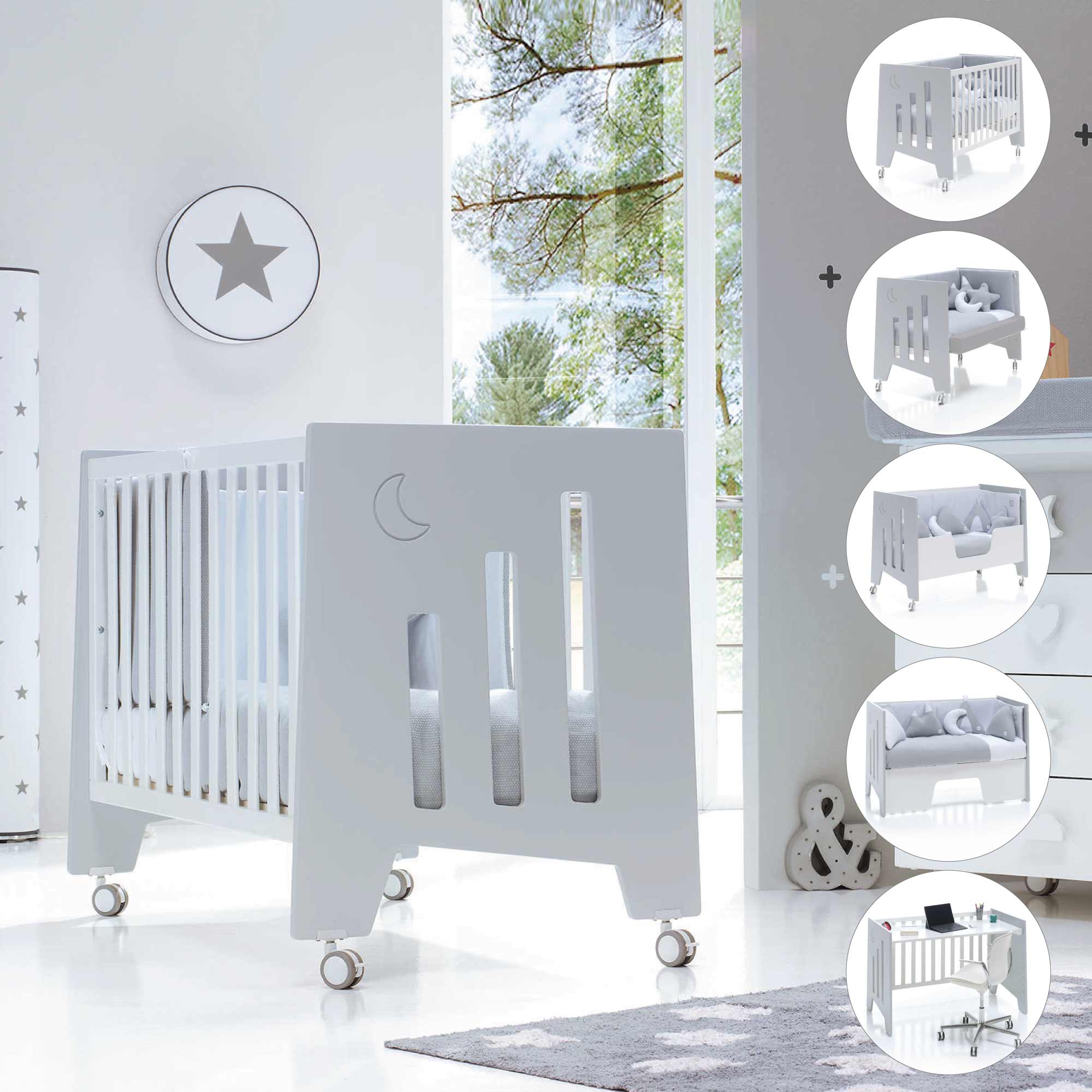 Las cunas para bebés, de medida 120x60 OMNI son uno de los muebles más versátiles y prácticos de nuestro catálogo. El modelo OMNI Grey es un 2 en 1, ya que de cunita convencional se transforma en escritorio. ¡Pero eso no es todo! Gracias a los diversos accesorios disponibles de cunas colecho, puedes convertirla también en cuna de colecho, cama y sofá infantil. Además, su lacado en blanco y gris mate será super fácil de combinar y decorar sin tener que renunciar a la elegancia de los tonos más neutros, al igual que el resto de nuestras cunas colecho de madera.