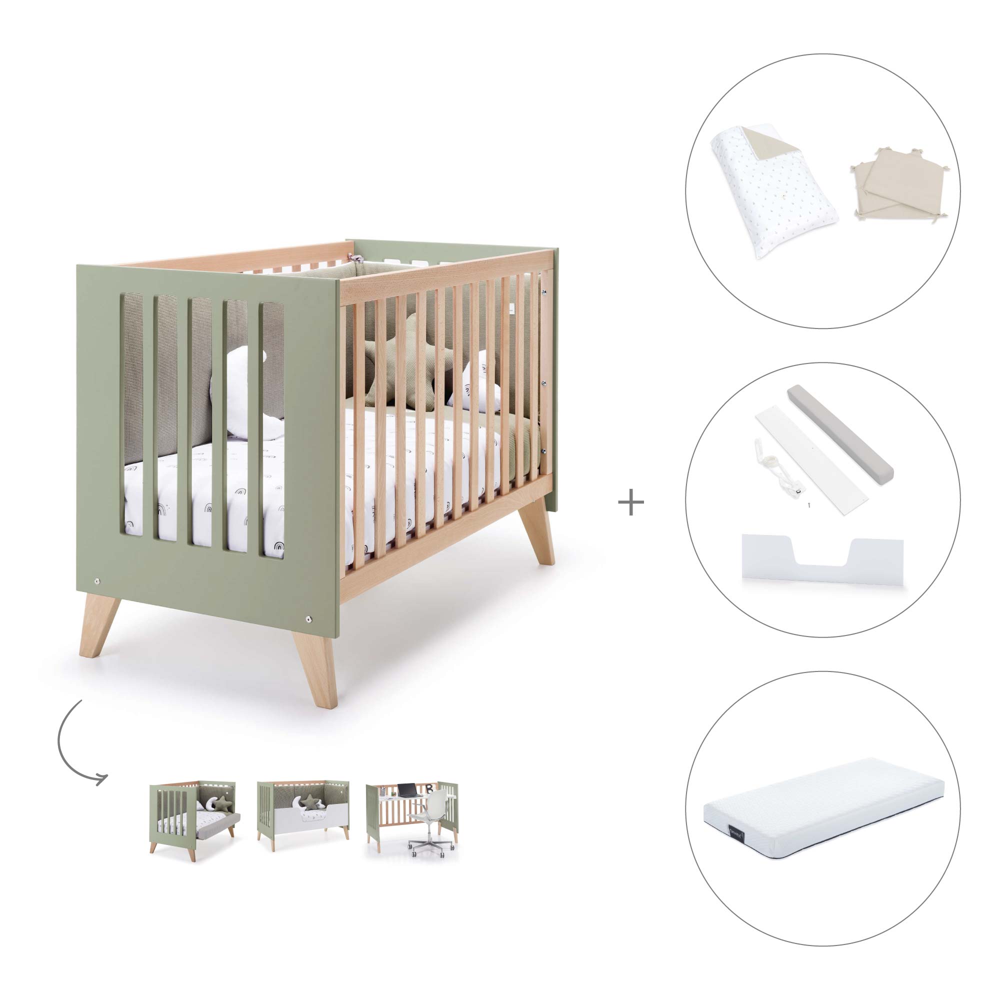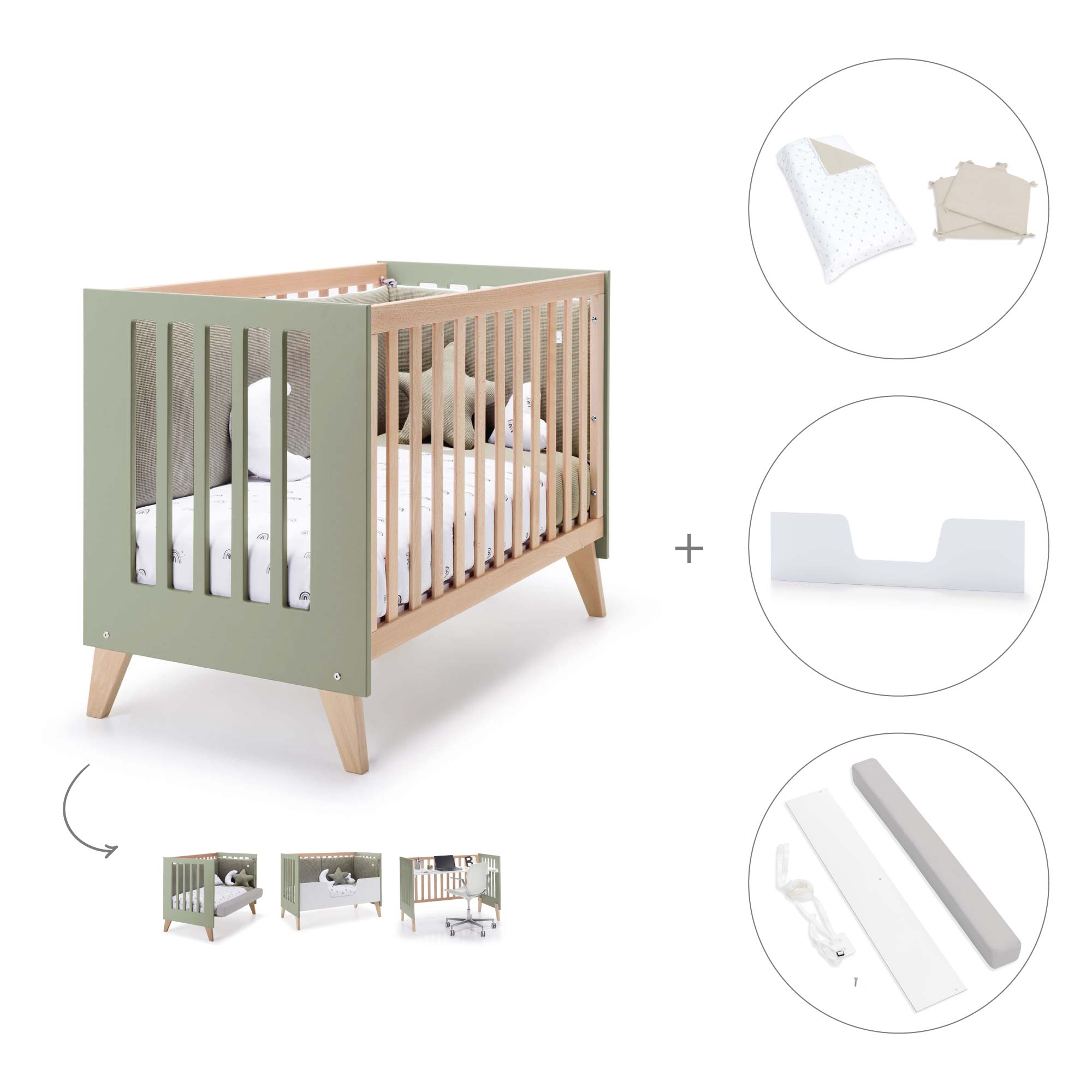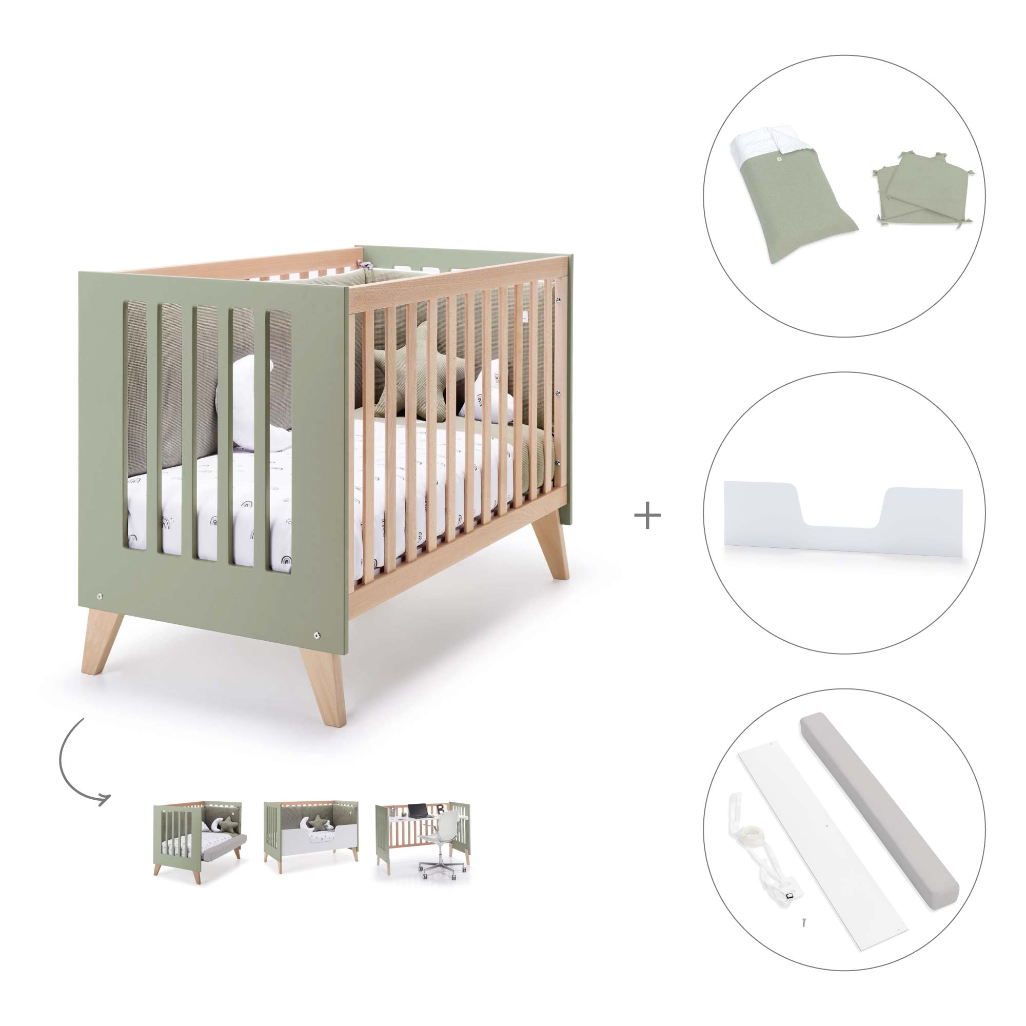 Os presentamos la cuna de colecho de madera y verde oliva NEXOR de estilo nórdico. Con ella podrás crear un espacio lleno de mágia y dulzura gracias a la atemporalidad del blanco y a la calidez que desprende la madera de su diseño. Puedes llegar a transformarla hasta en 4 etapas diferentes gracias a los complementos disponibles para ella. La podrás usar como cuna convencional, cuna de colecho pegada a la cama, camita infantil o escritorio. Además, como el resto de nuestras cunas de bebés, puedes vestirla con los set textiles que más te inspiren. ¡Será maravilloso!