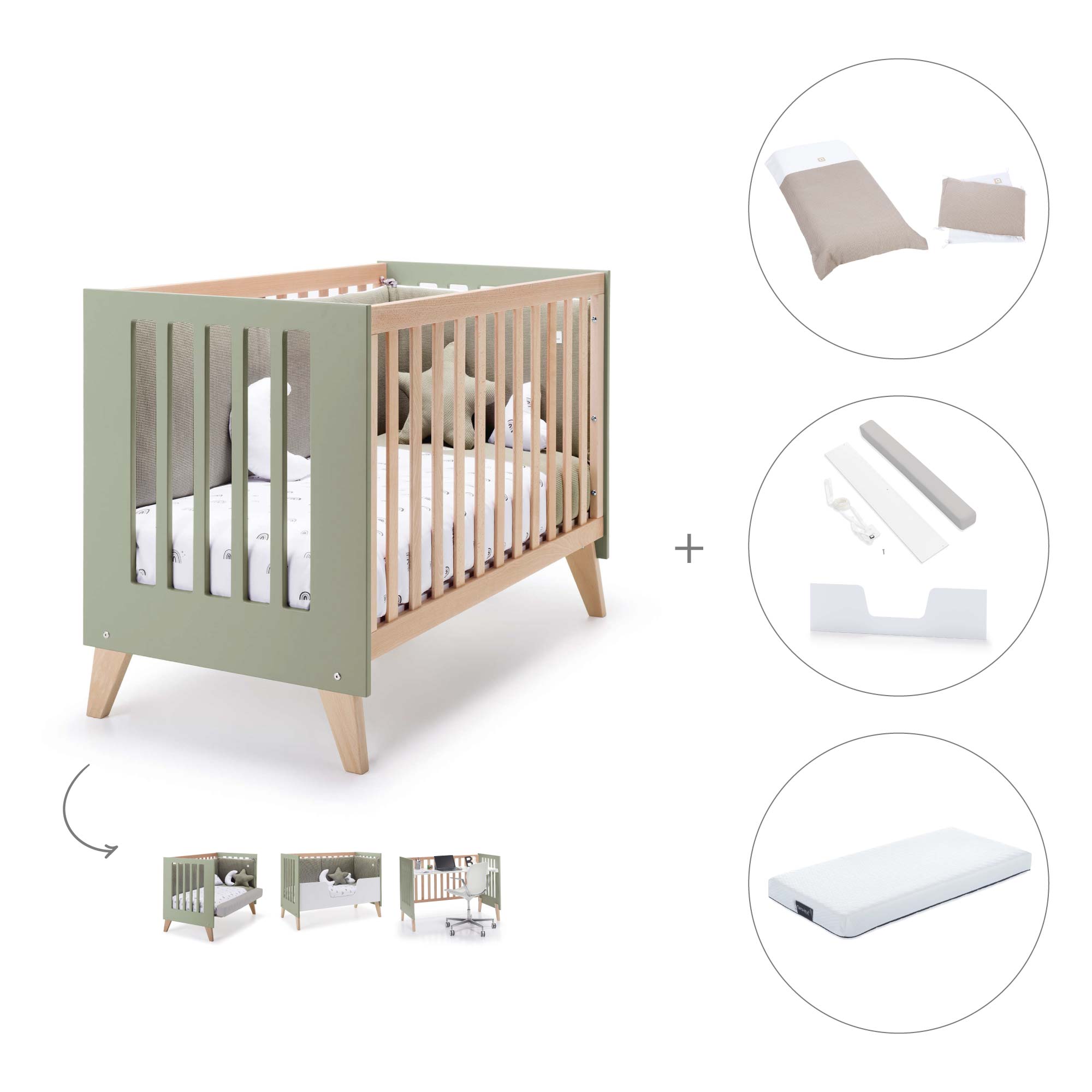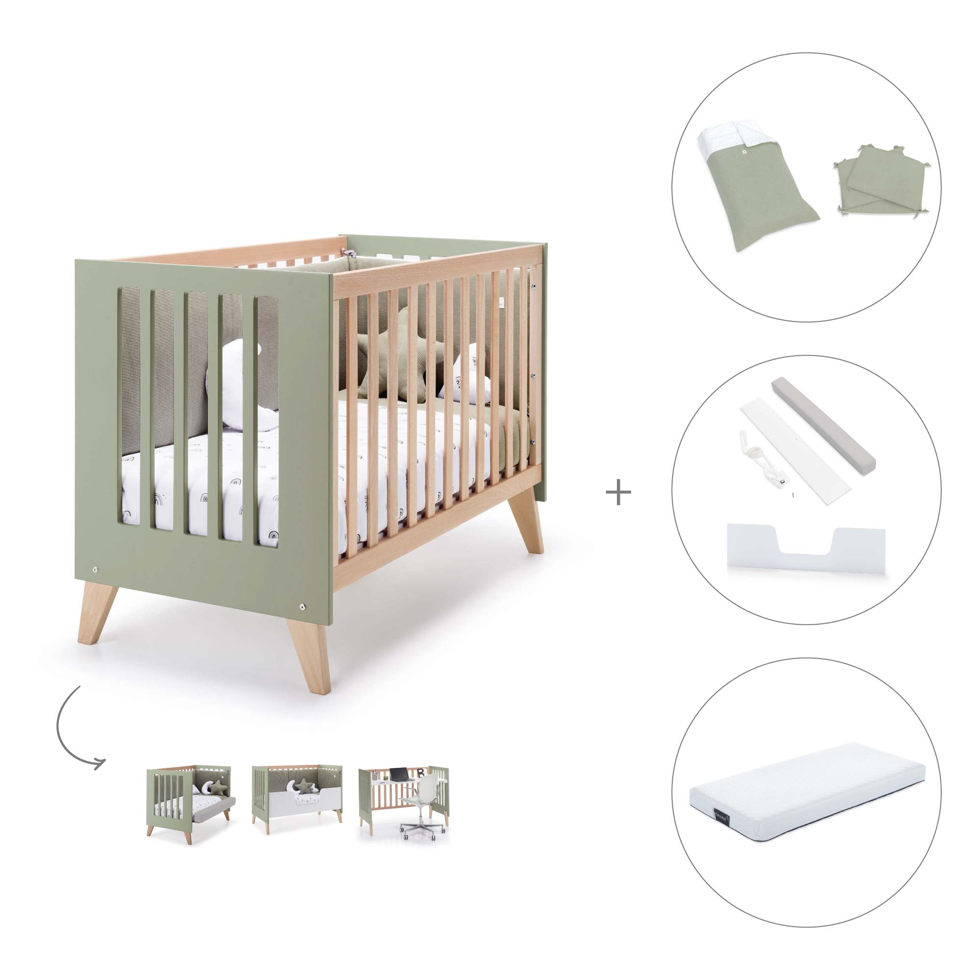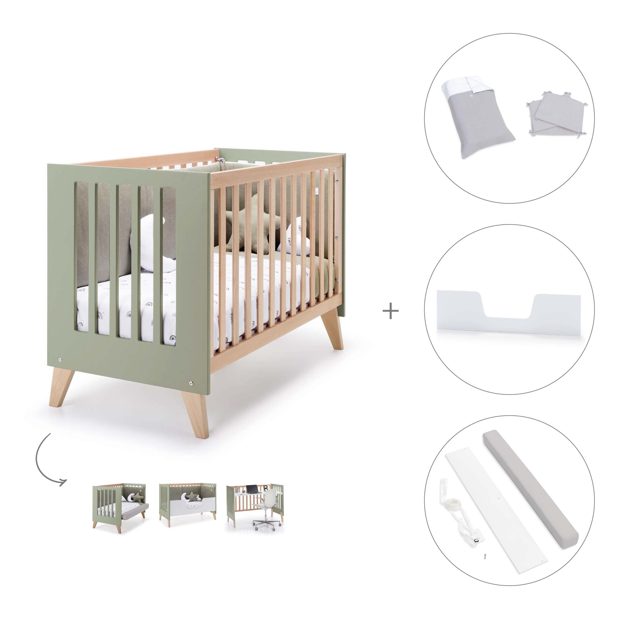 Os presentamos la cuna de colecho de madera y verde oliva NEXOR de estilo nórdico. Con ella podrás crear un espacio lleno de mágia y dulzura gracias a la atemporalidad del blanco y a la calidez que desprende la madera de su diseño. Puedes llegar a transformarla hasta en 4 etapas diferentes gracias a los complementos disponibles para ella. La podrás usar como cuna convencional, cuna de colecho pegada a la cama, camita infantil o escritorio. Además, como el resto de nuestras cunas de bebés, puedes vestirla con los set textiles que más te inspiren. ¡Será maravilloso!