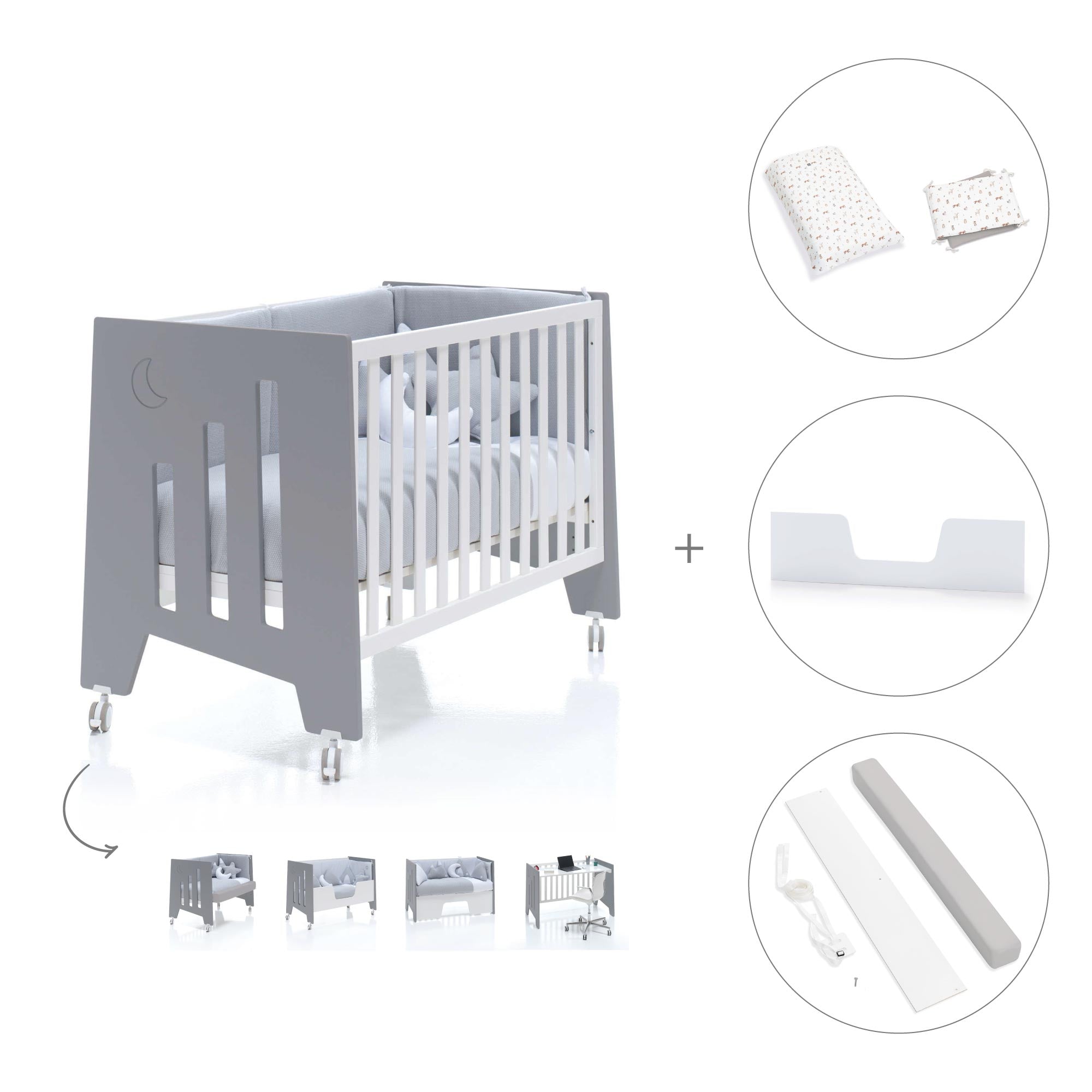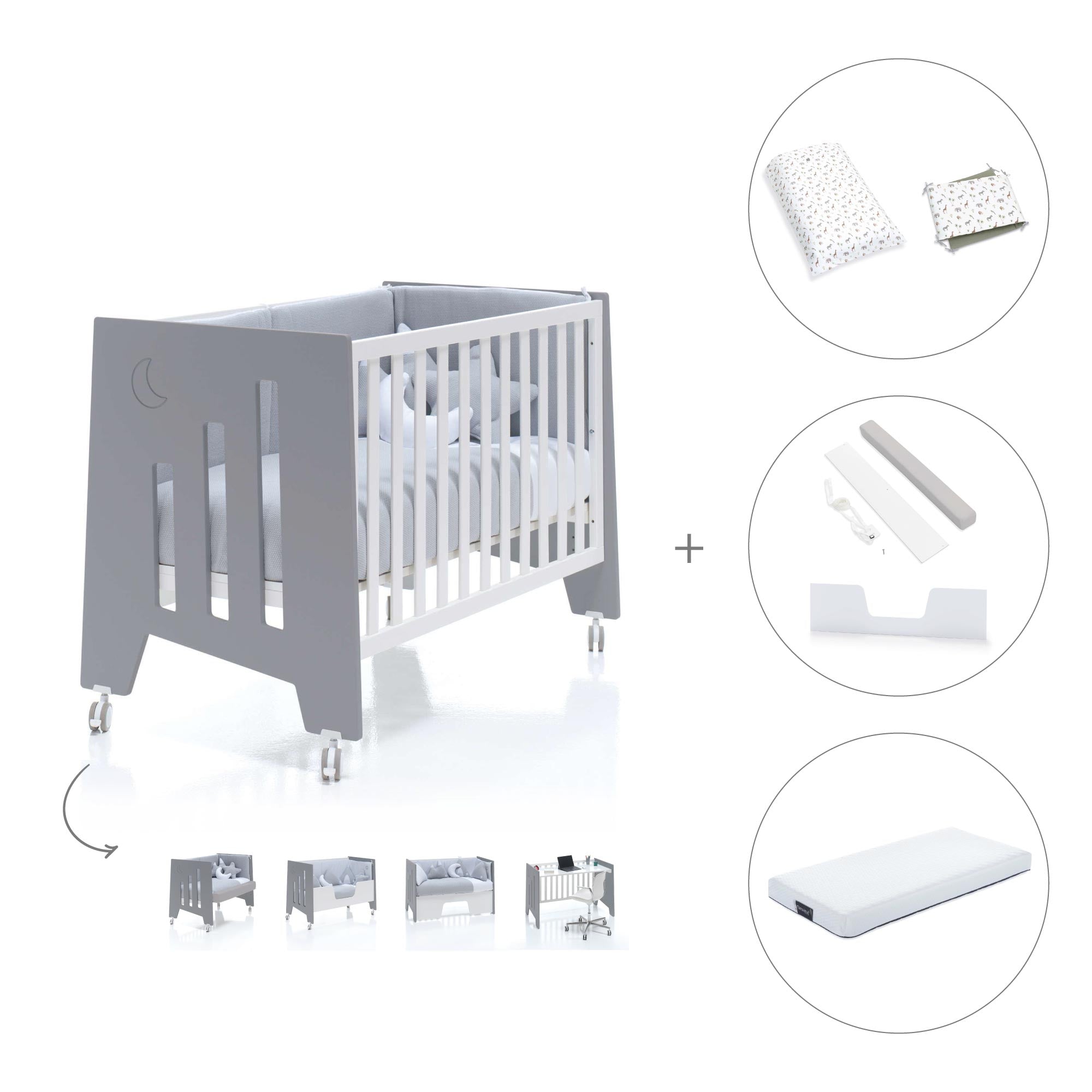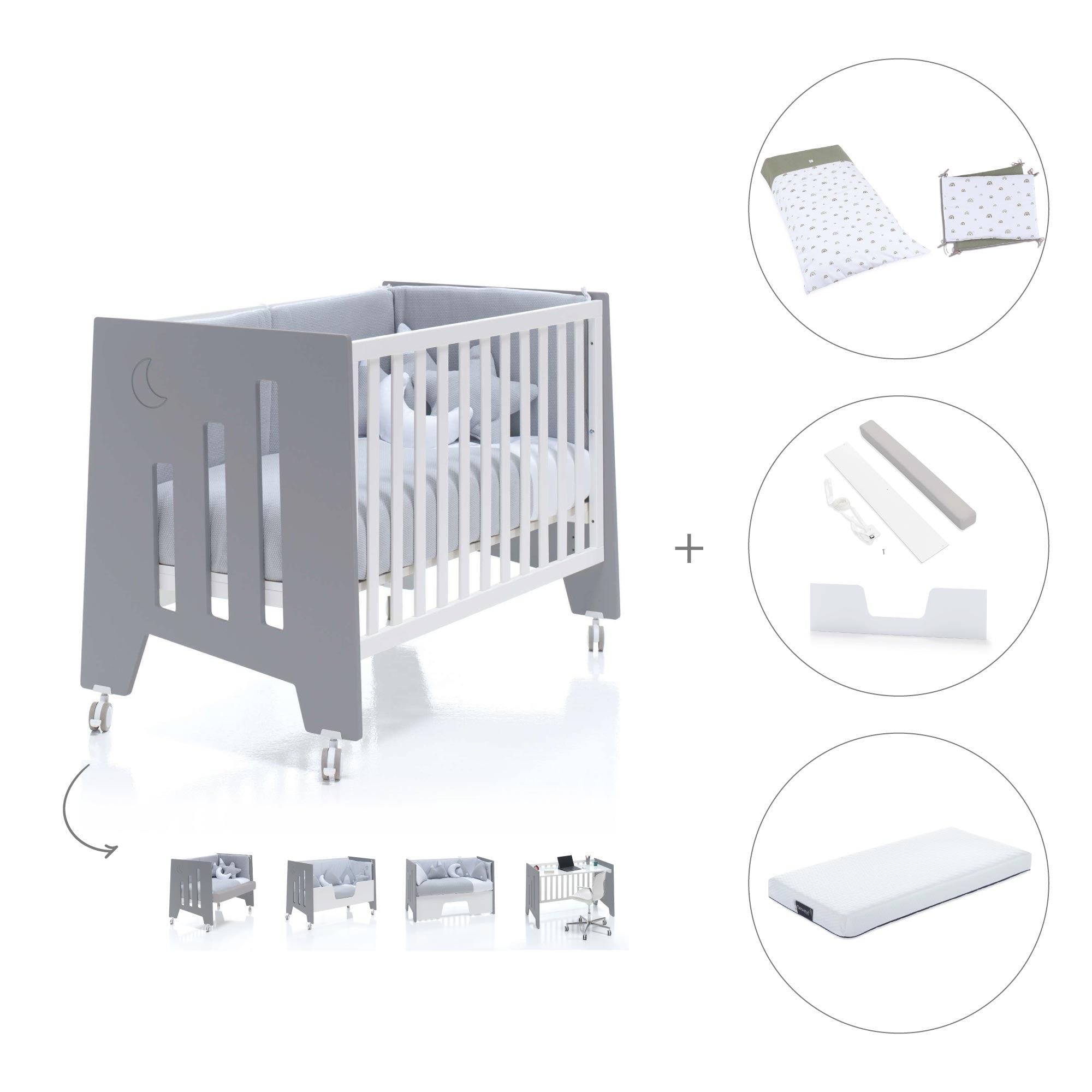 Completa la habitación del bebé con esta cuna de colecho convertible (5en1) de 60x120 cm en gris antracita y blanco. Una combinación de colores perfecta para aportar elegancia y neutralidad al cuarto del bebé. De serie, esta cuna se convierte en escritorio, pero, añadiendo los kits correspondientes, se puede convertir en cuna de colecho para pegar a la cama de matrimonio o bien en una cama o sofá infantil. De esta manera tendrás 5 muebles en 1.