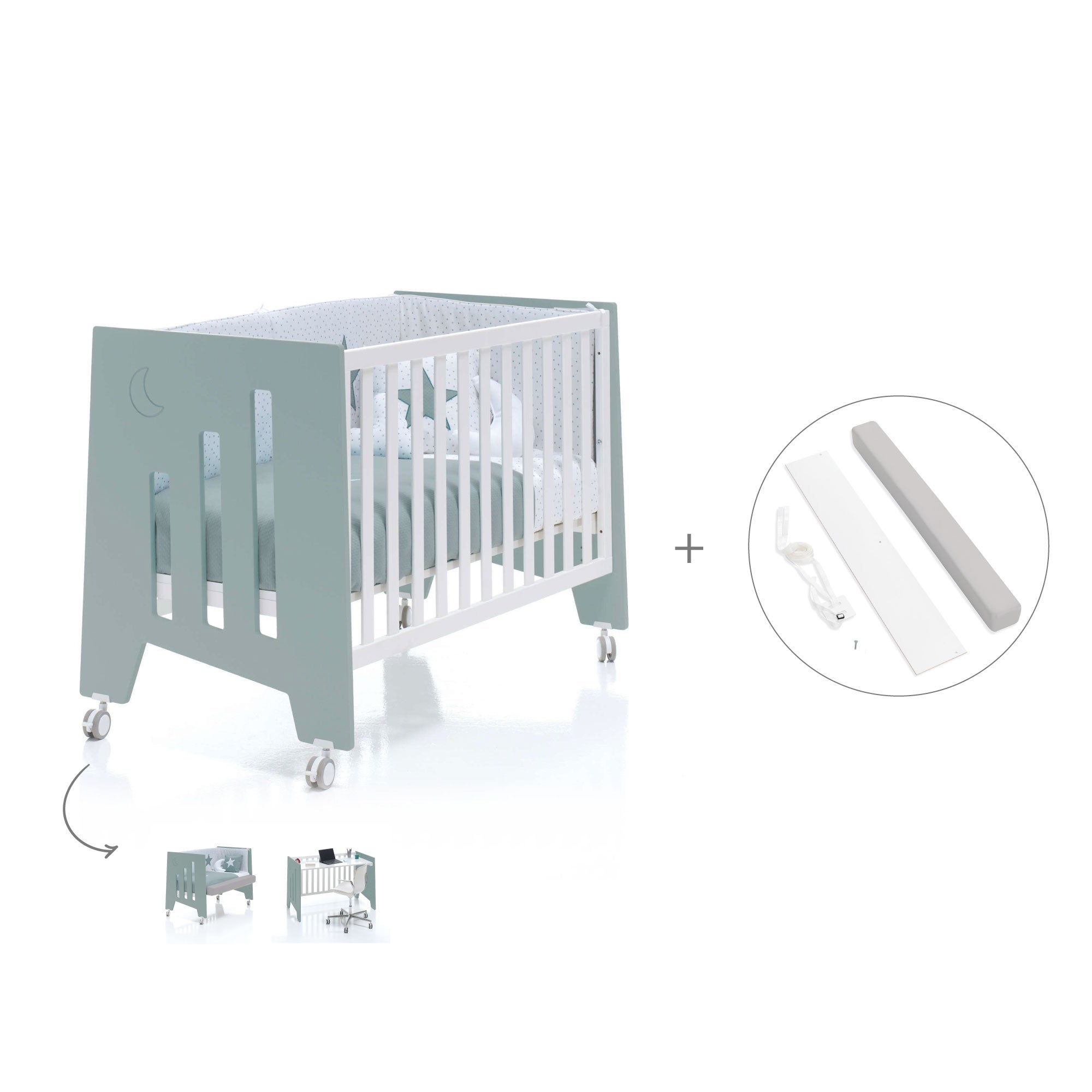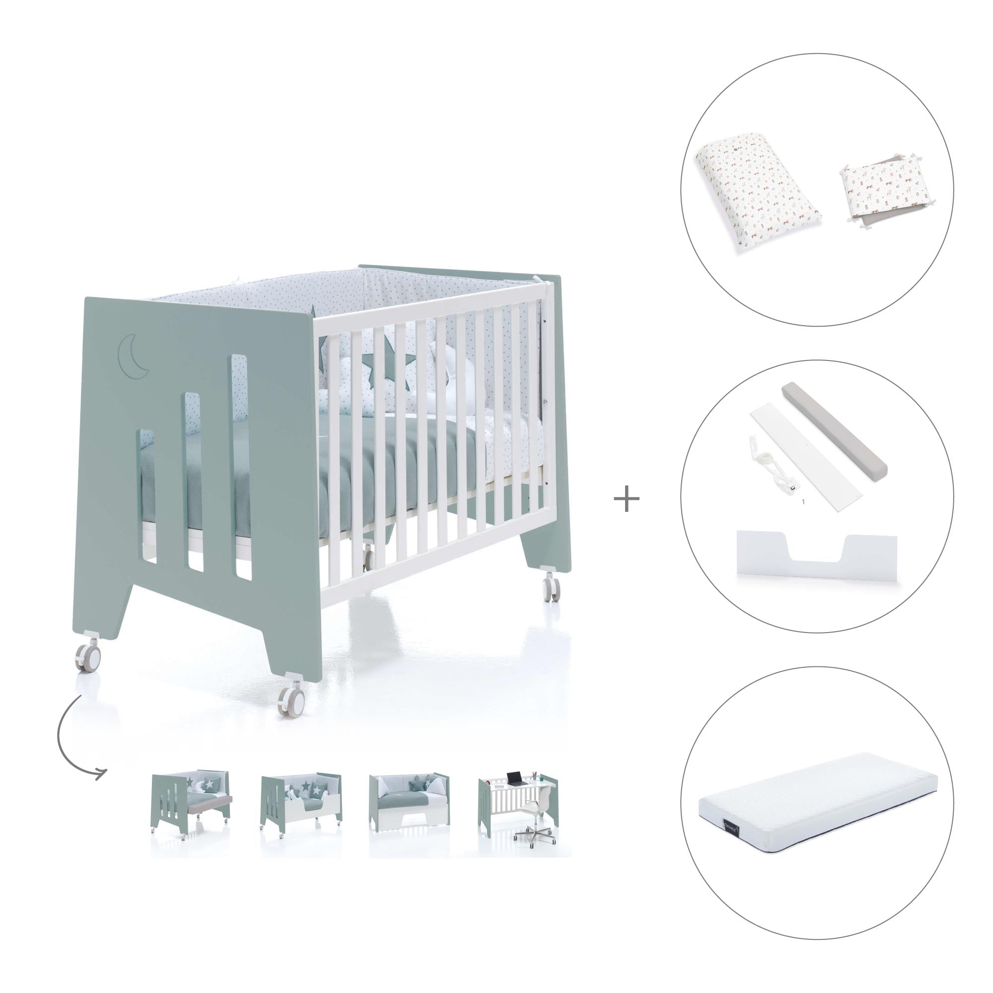 Te encantará esta cuna colecho bebé (5en1) 60x120 cm en color verde agua y blanco. Se trata de una cuna de medidas 60x120 cm que se convierte en escritorio de serie. No obstante, añadiendo los accesorios opcionales puede llegar a convertirse en cuna de colecho con ruedas, camita infantil o sofá infantil. De esta manera tendrás 5 muebles en 1. Dispone de 5 alturas de somier, para poder ir adaptandola a medida que el bebé crece; o bien, para adaptar el colecho a la cama de matrimonio. Dispone de ruedas para poder moverla por la casa con facilidad. Además, su compinación de colores aportará frescura a la habitación del bebé.