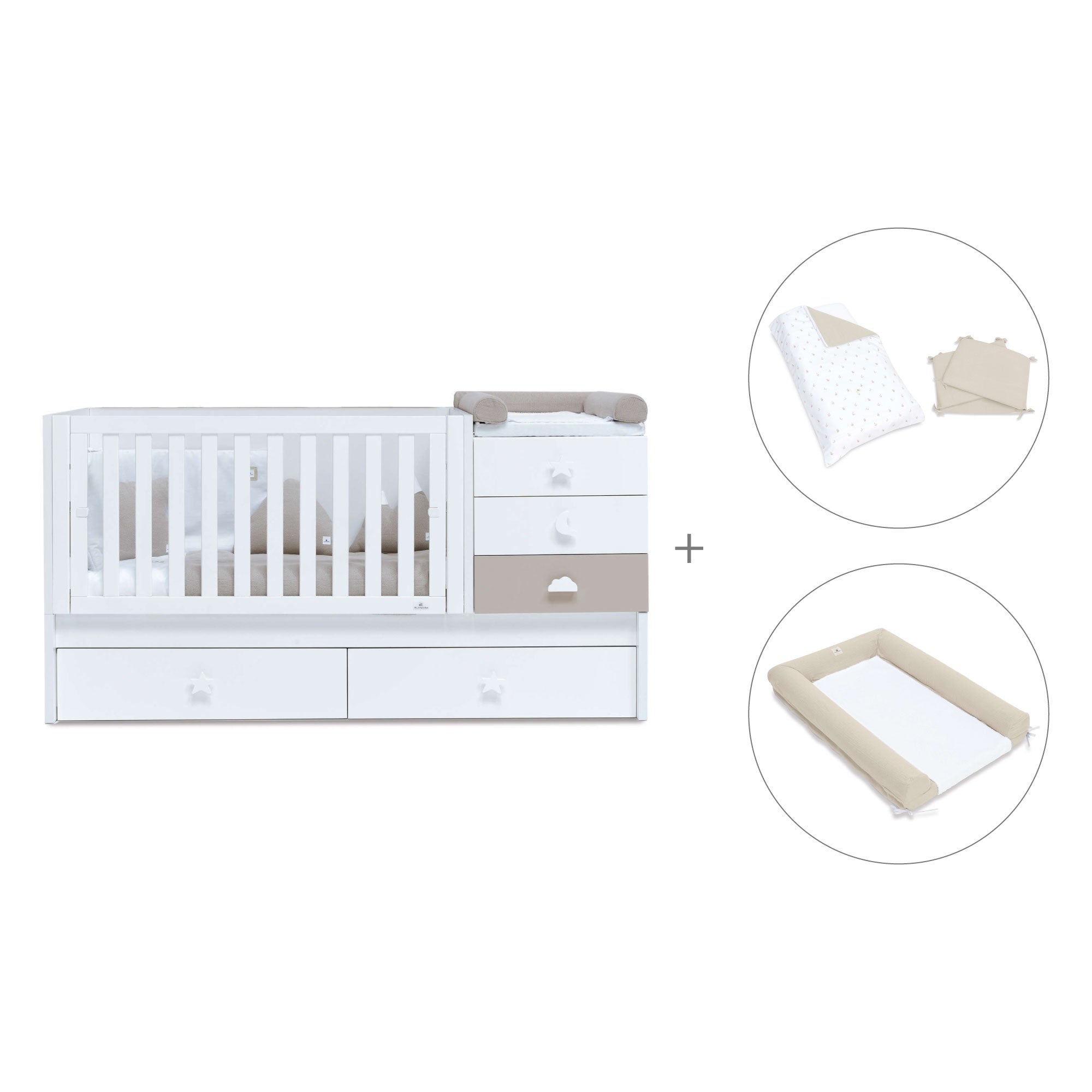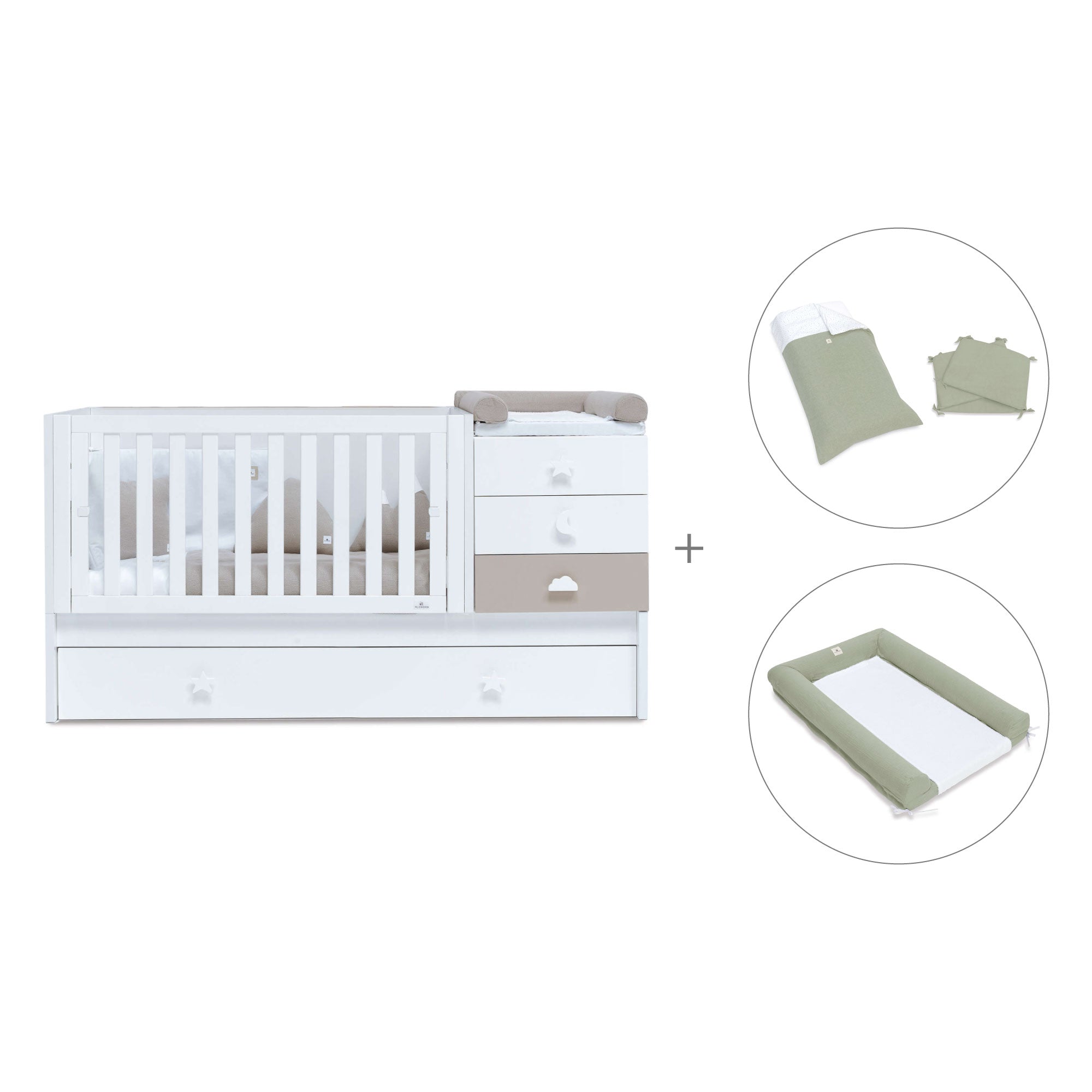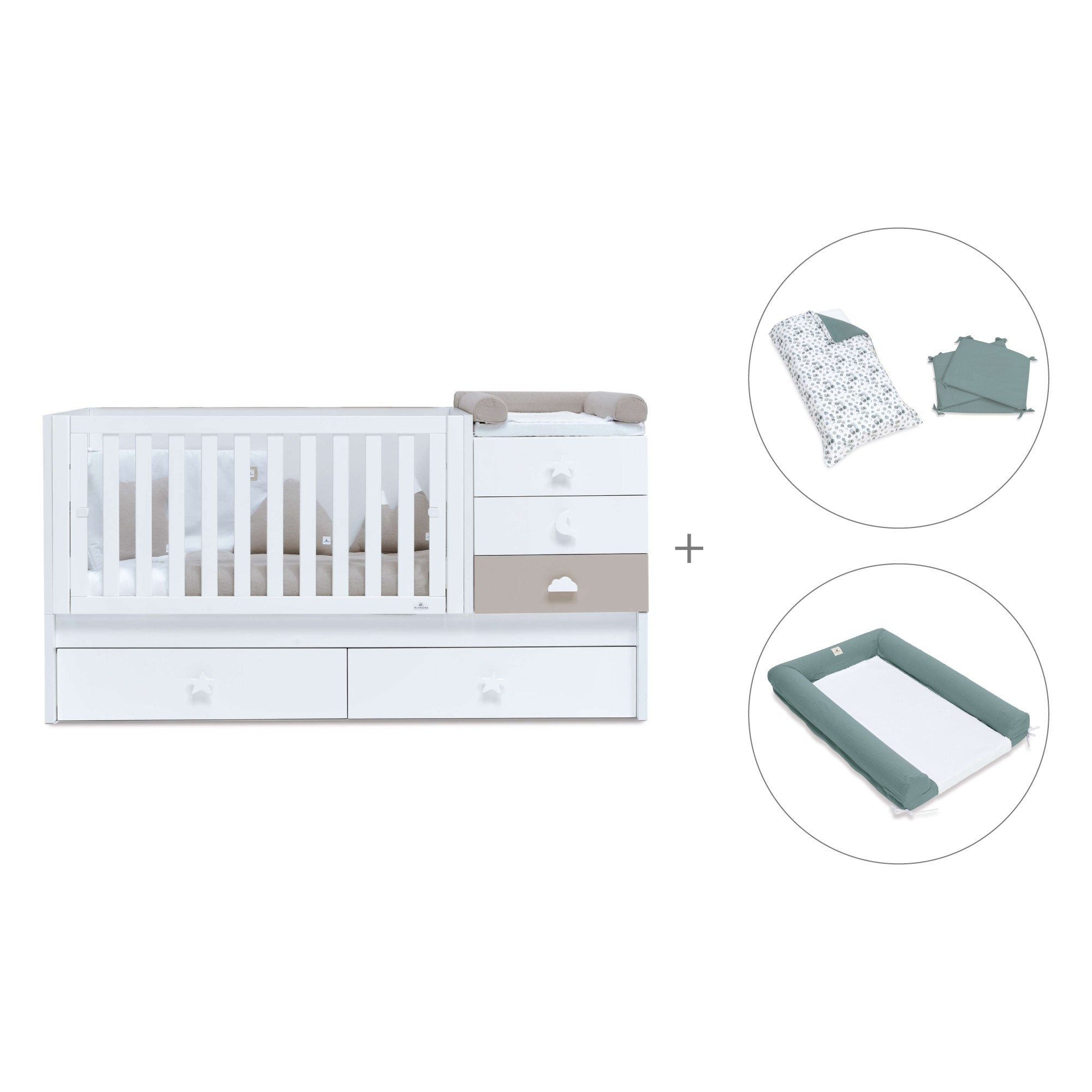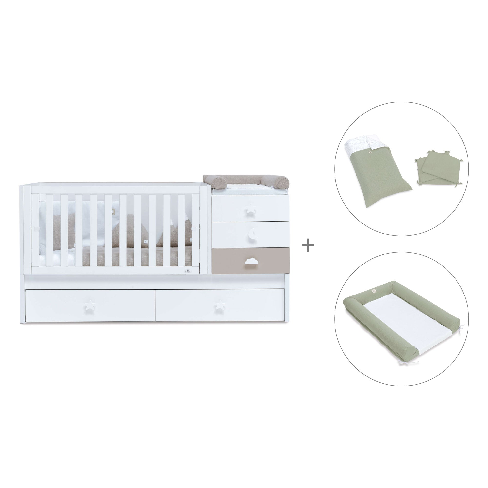 Descubre todos los maravillosos rinconcitos de la cuna evolutiva y convertible Sero Bubble Arena. ¡Es una pasada! Este modelo en tonos tierra es perfecto si quires conseguir un espacio neutro, pero cálido, y lograr que la cunita añada luminosidad a la estancia gracias al lacado en blanco mate. Además, como es evolutiva, abarcará las diversas etapas de crecimiento de tu pequeño tesoro hasta que se haga mayor. Para completarla, combínala con los sets textiles que más te gusten para cunas convertibles.