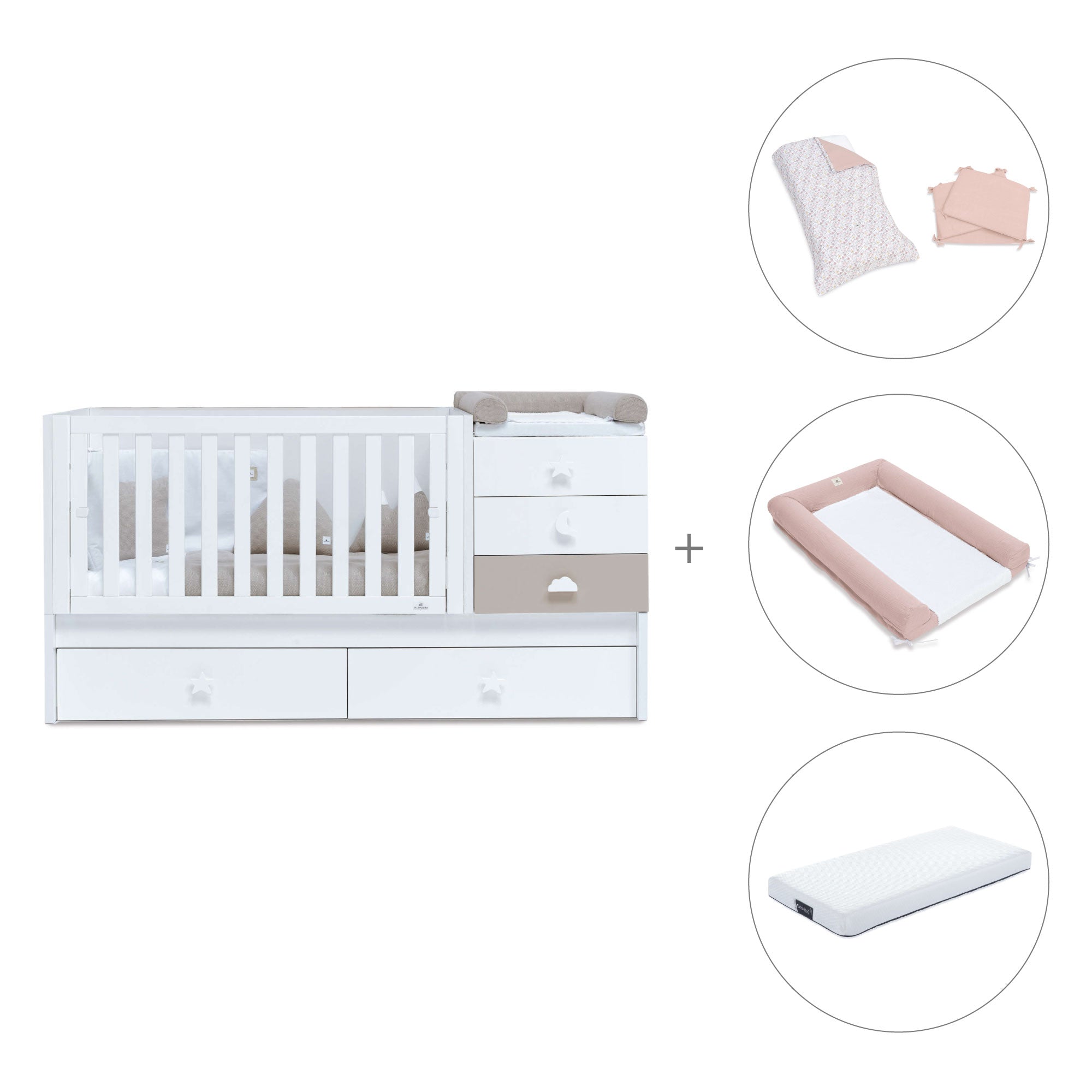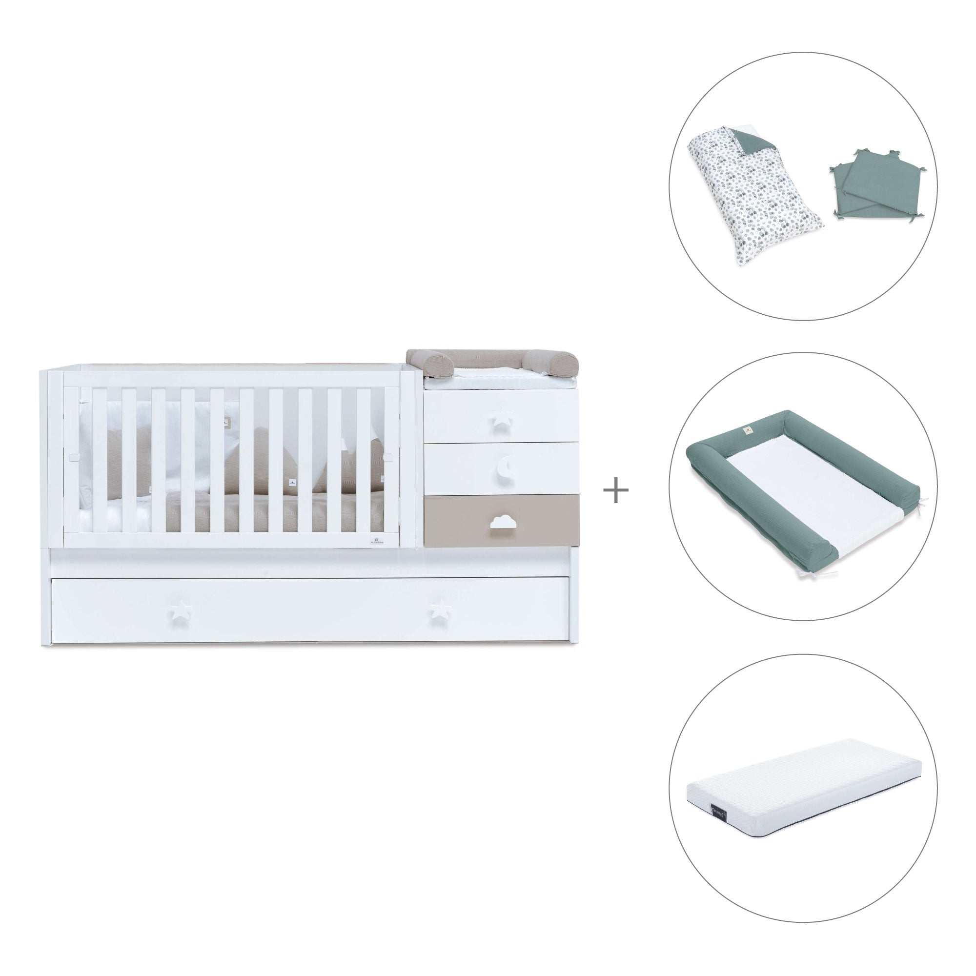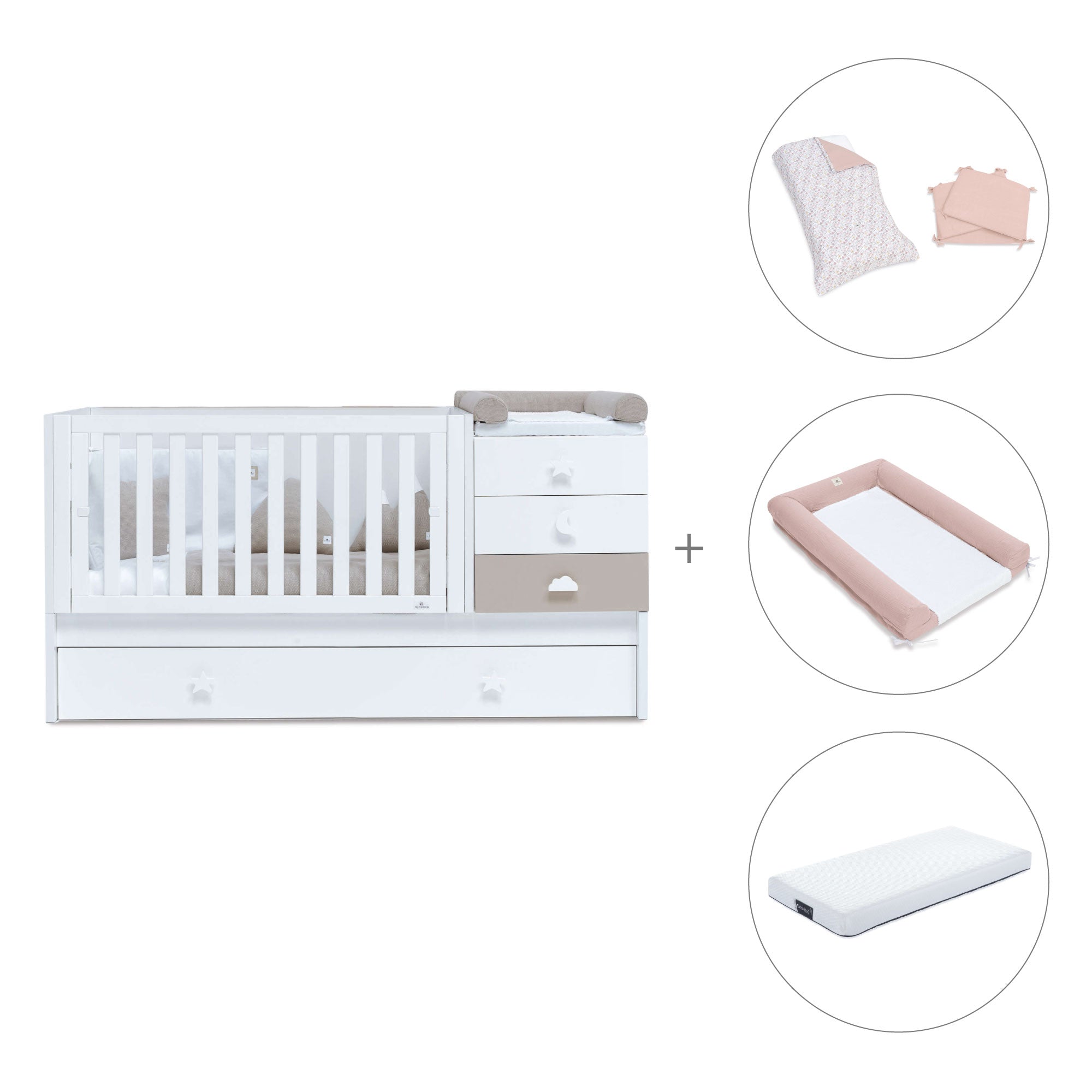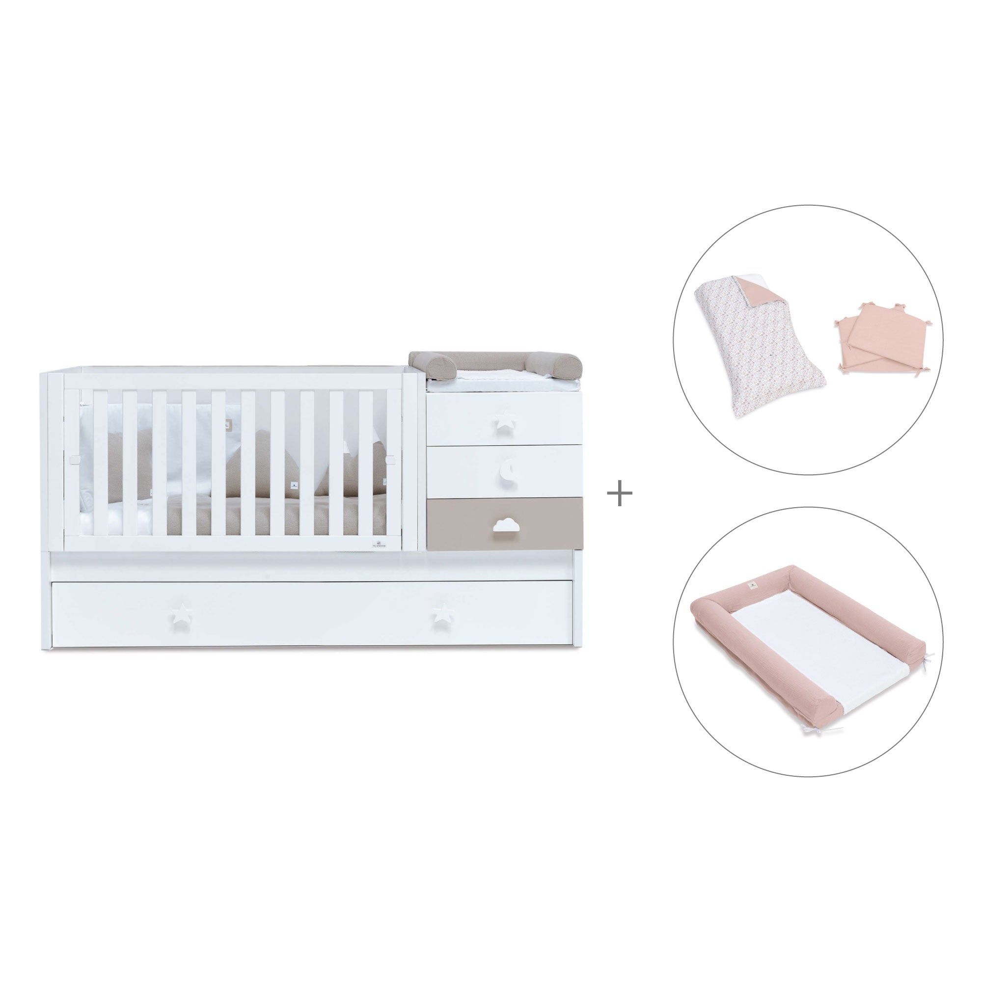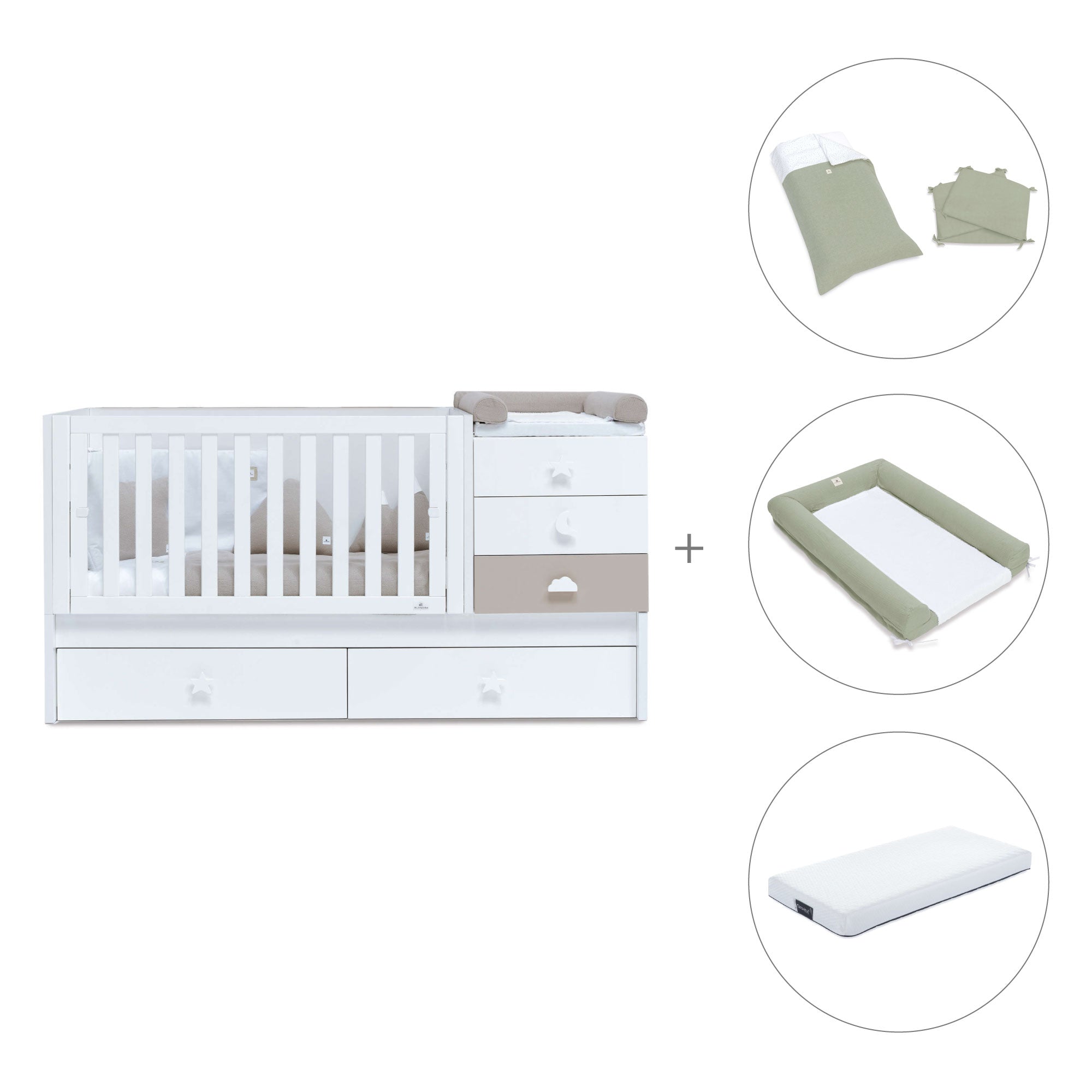 Descubre todos los maravillosos rinconcitos de la cuna evolutiva y convertible Sero Bubble Arena. ¡Es una pasada! Este modelo en tonos tierra es perfecto si quires conseguir un espacio neutro, pero cálido, y lograr que la cunita añada luminosidad a la estancia gracias al lacado en blanco mate. Además, como es evolutiva, abarcará las diversas etapas de crecimiento de tu pequeño tesoro hasta que se haga mayor. Para completarla, combínala con los sets textiles que más te gusten para cunas convertibles.