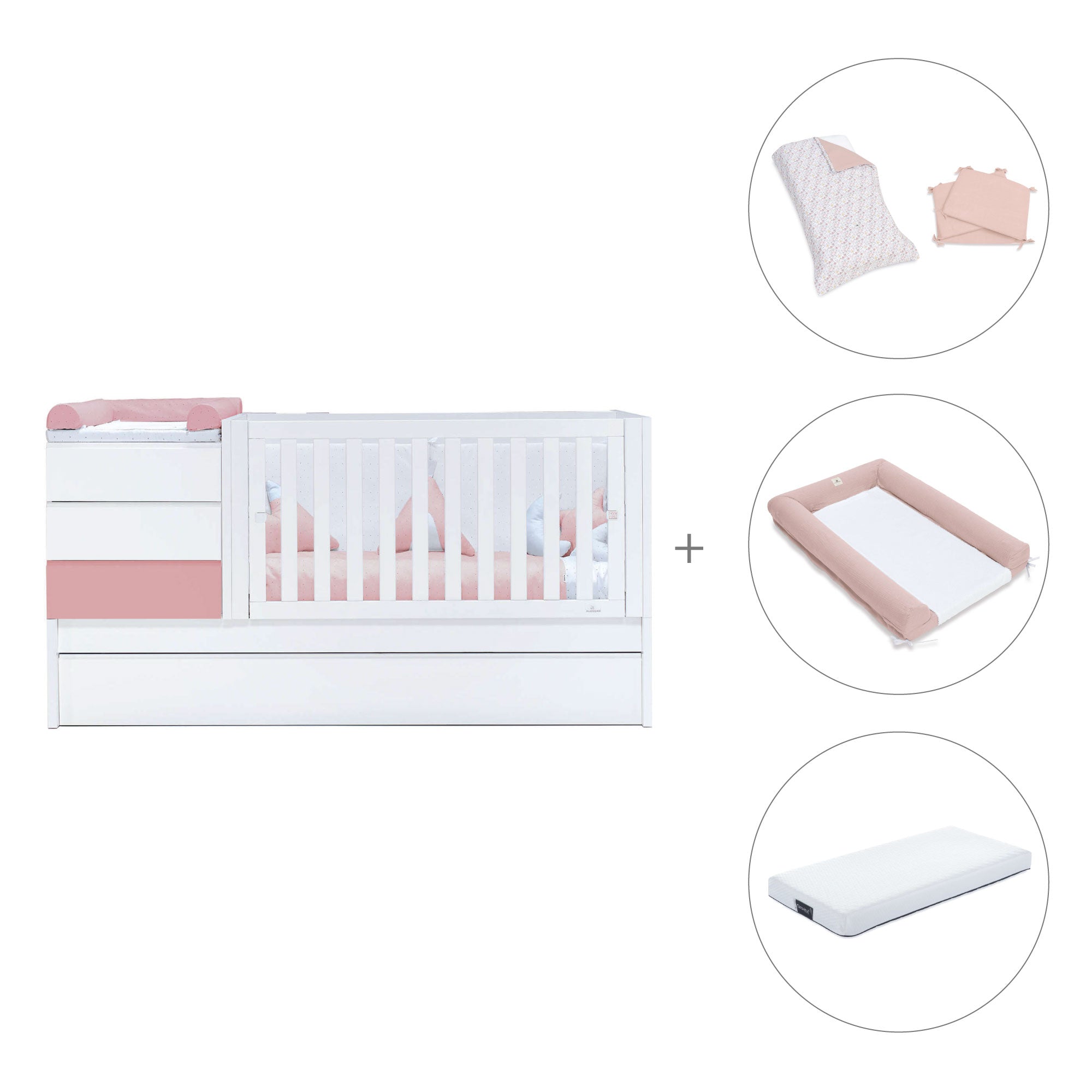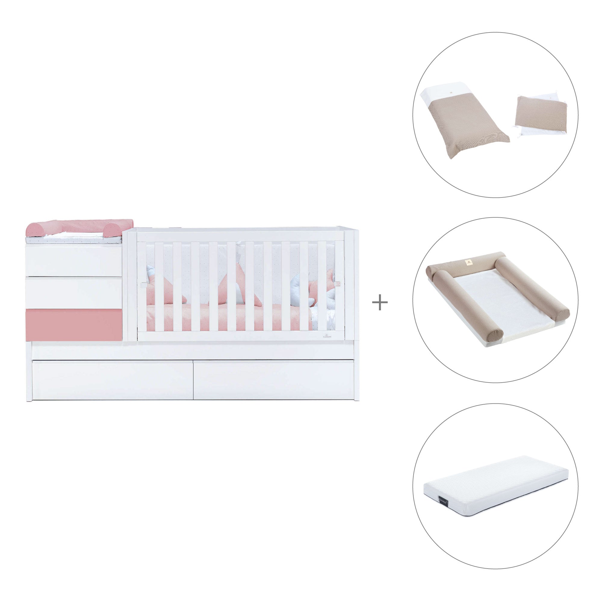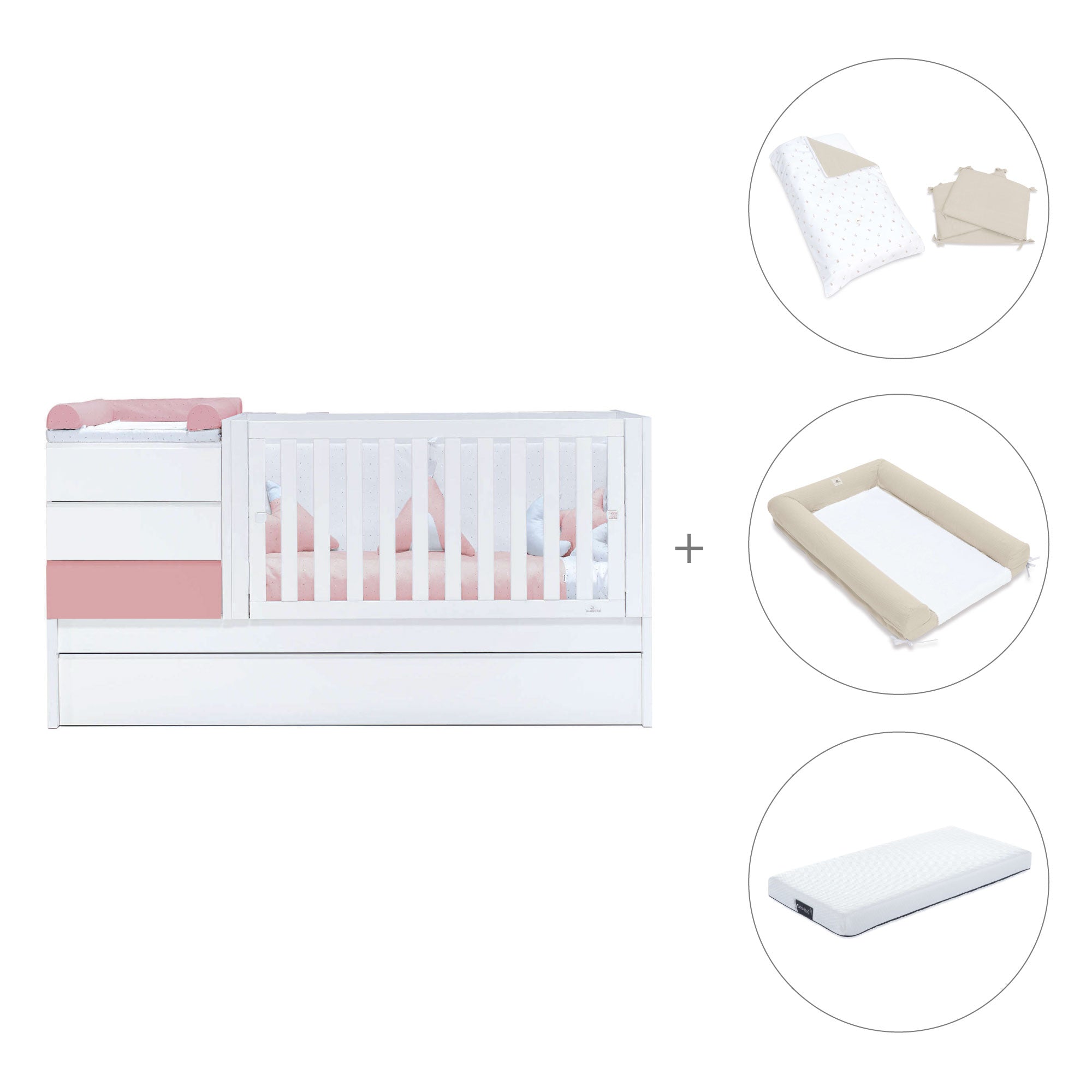 - Pack textil y colchón (opcional) incluye: un nórdico (ref. 626), un protector (ref. 627), un cambiador 60x90 cm (ref. 631) y un colchón antiahogo de 70x140 cm (ref. ZH70-140).