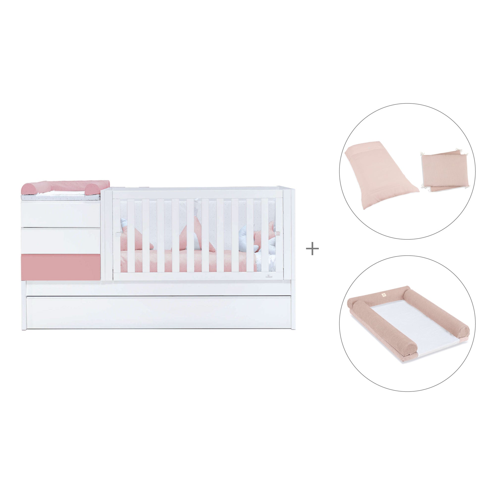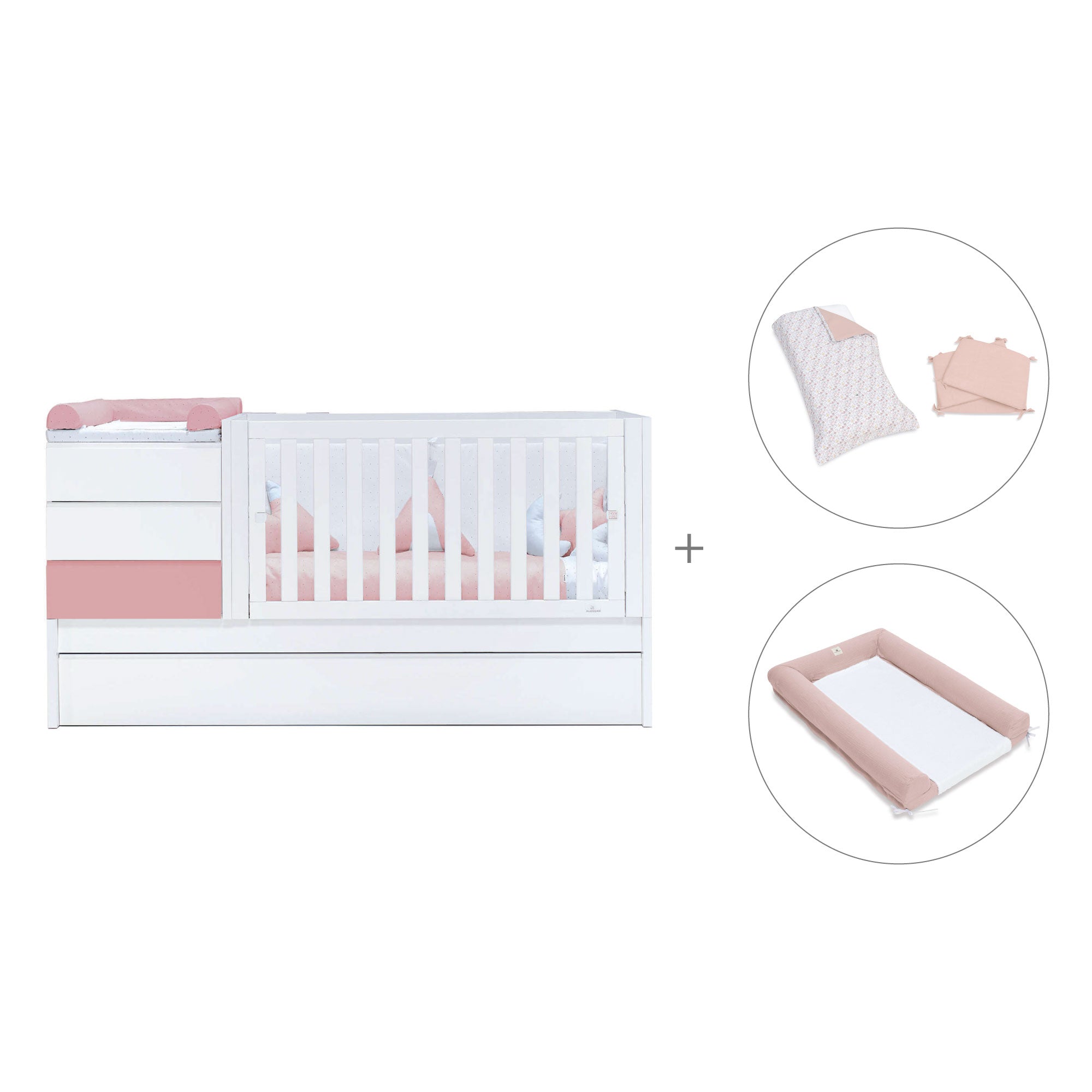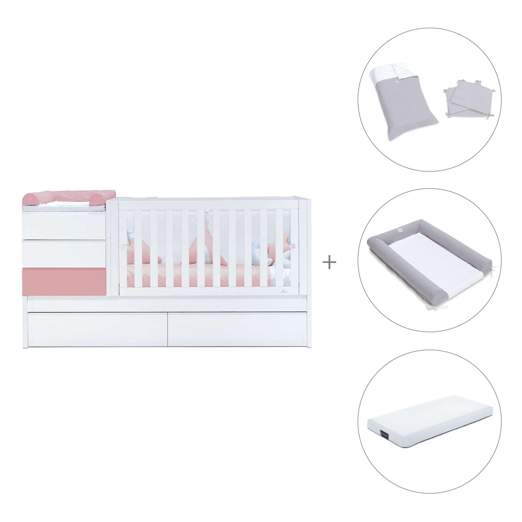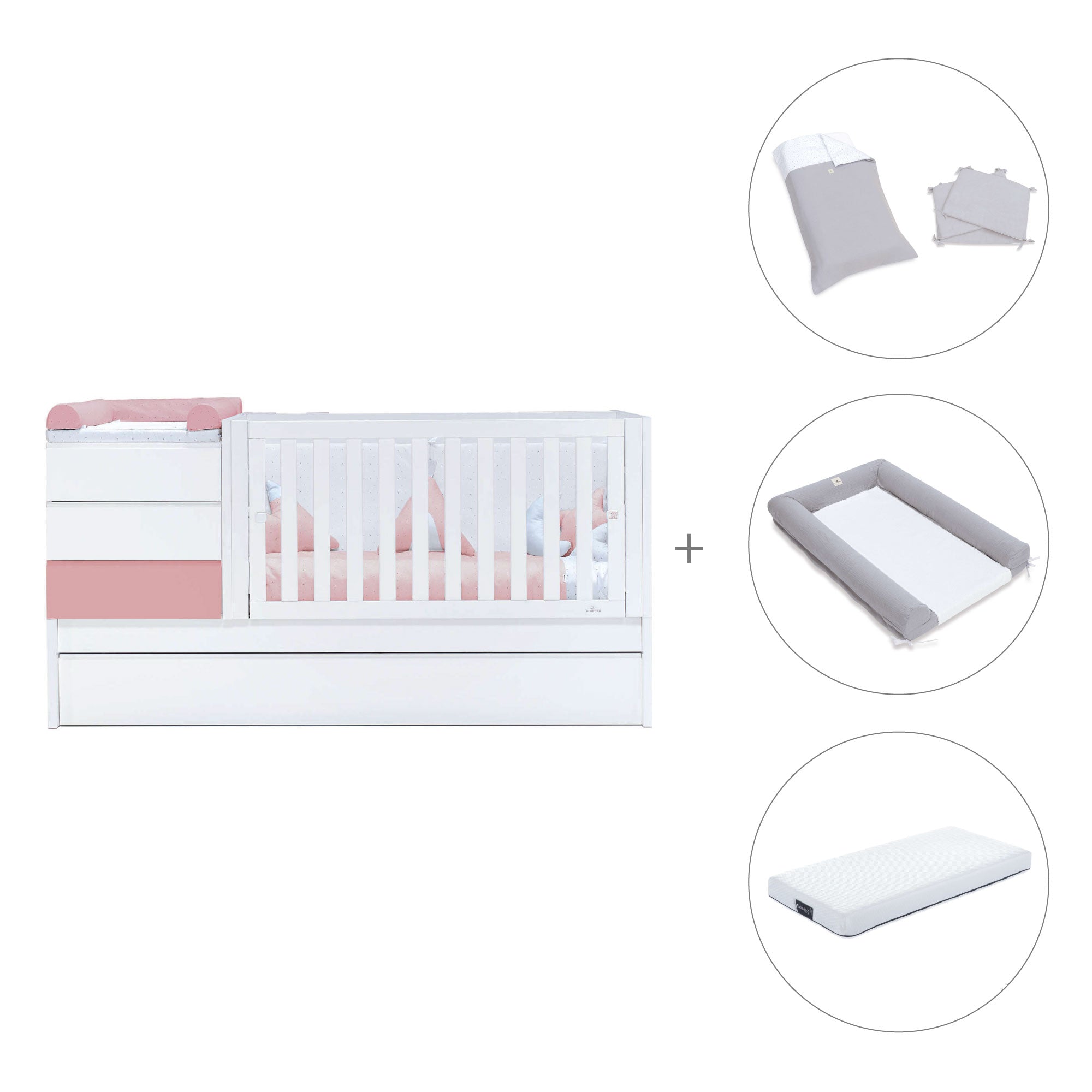- Pack textil y colchón (opcional) incluye: un nórdico (ref. 626), un protector (ref. 627), un cambiador 60x90 cm (ref. 631) y un colchón antiahogo de 70x140 cm (ref. ZH70-140).
