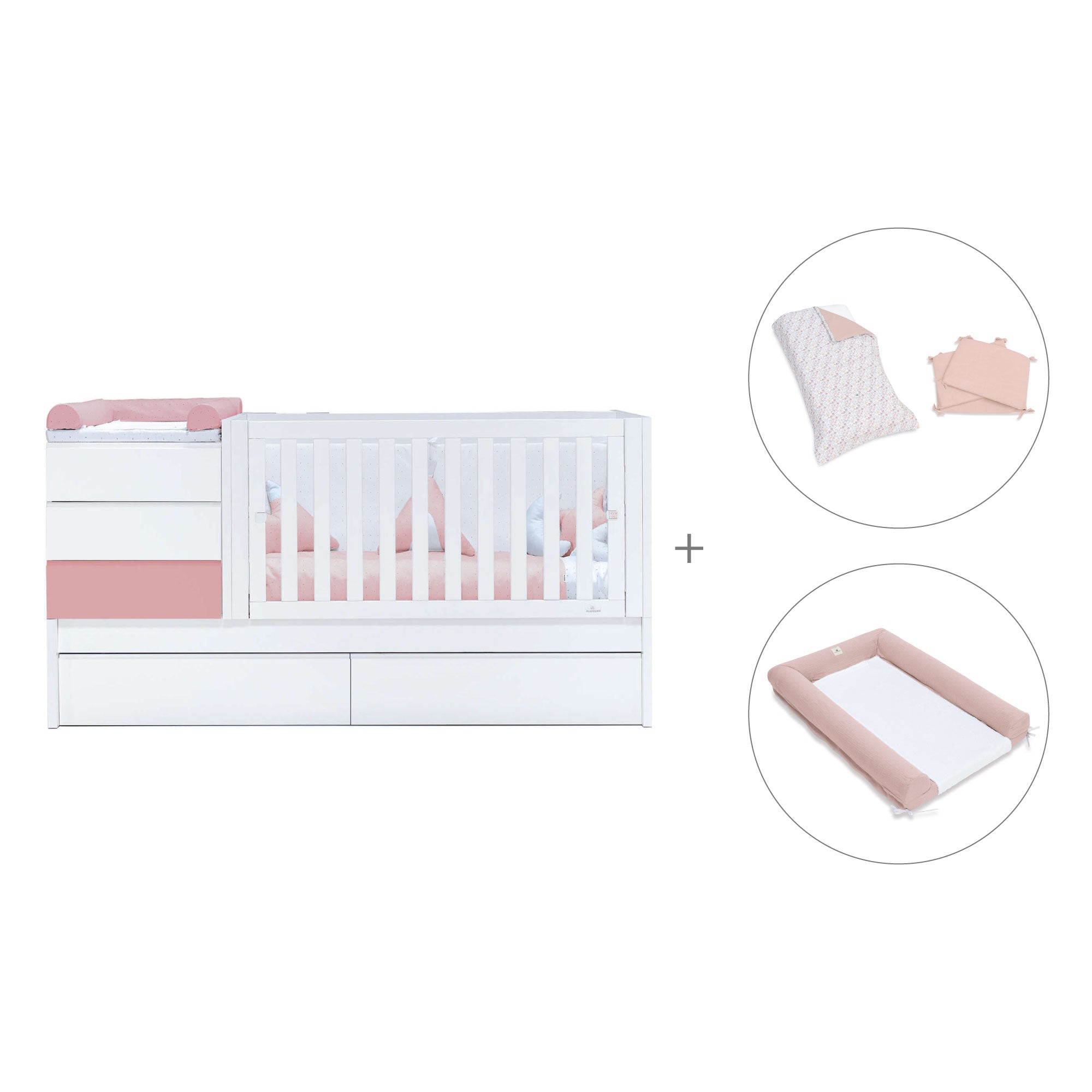 Amuebla y decora la habitación de tu futura princesa con esta cuna convertible duradera, la cual podrás usar desde los 00 años hasta más allá de los 18 años. Este modelo combina el color blanco con el rosa. Dispone de una zona cambiador (para cambiador de 60x90 cm), la zona de la cuna de 70x140 cm, varias estanterías, una cajonera (con 3 cajones) y, en la parte inferior, una cama nido o cajones (a elegir). Pasados los primeros 5 años del bebé, ya la puedes convertir en una habitación infantil-juvenil completa con cama júnior de 90x200 cm, escritorio infantil, mesita y estantería con ruedas. Una solución muy práctica para aquellos papás que empiezan desde cero.
