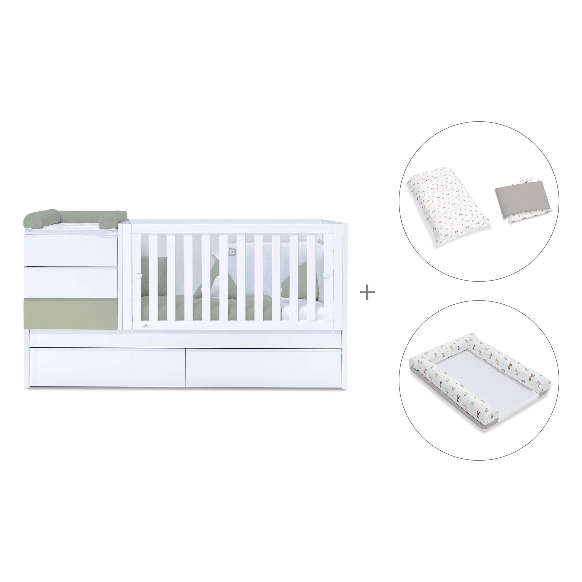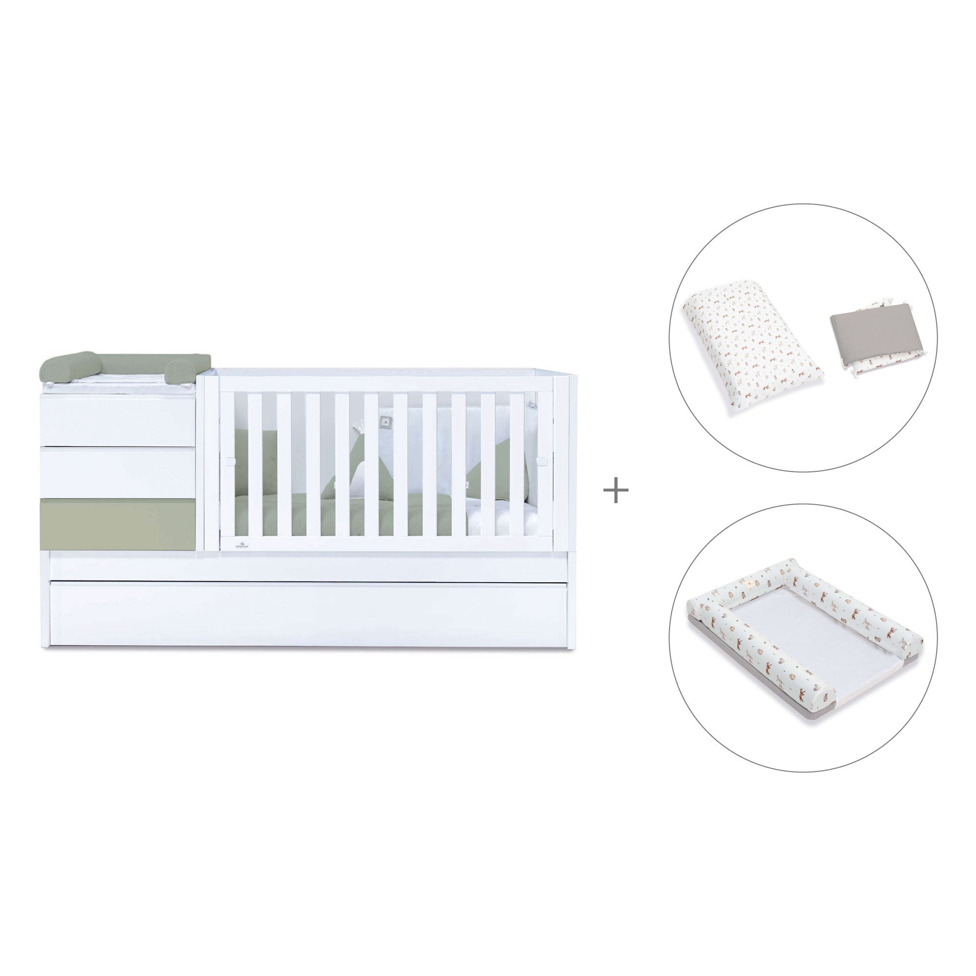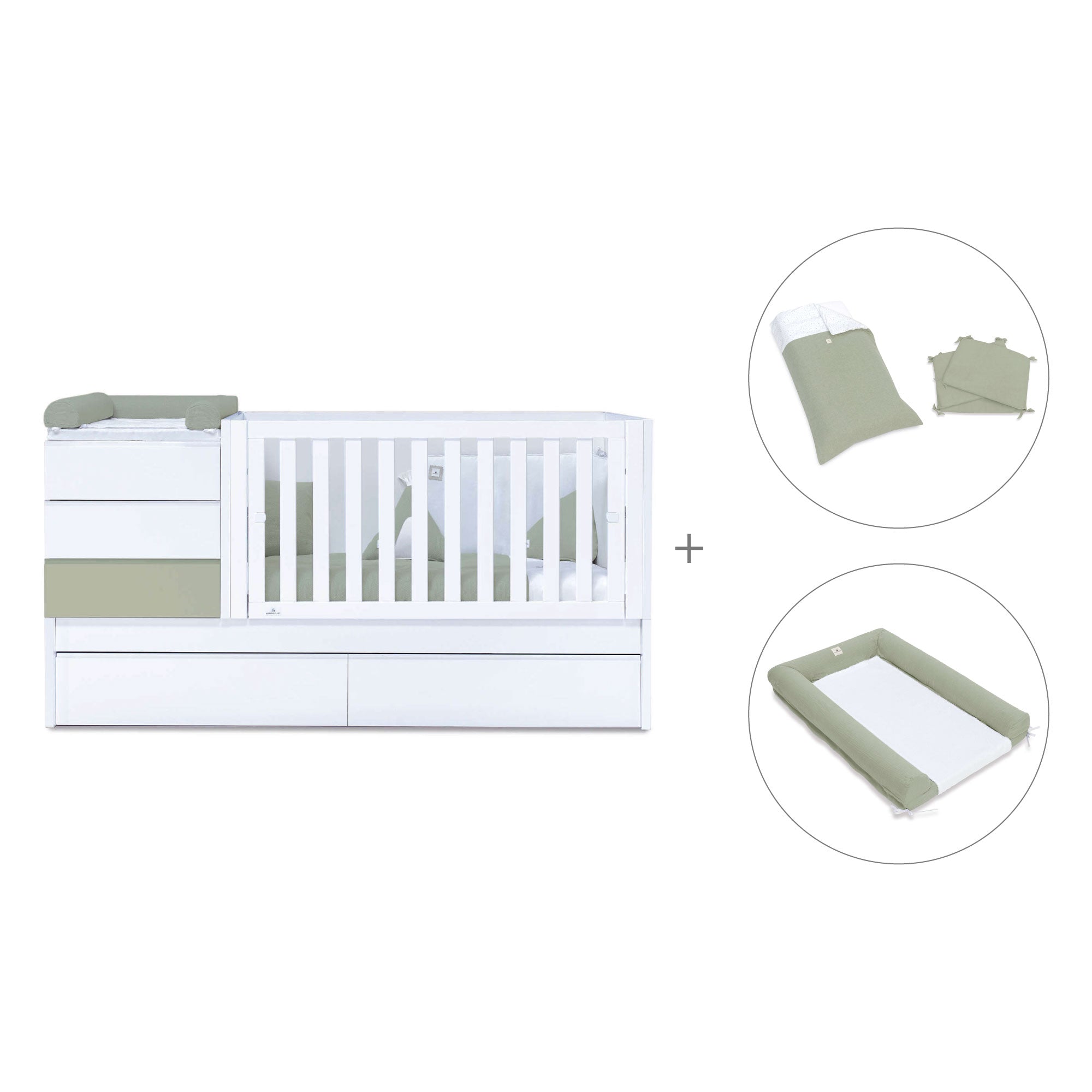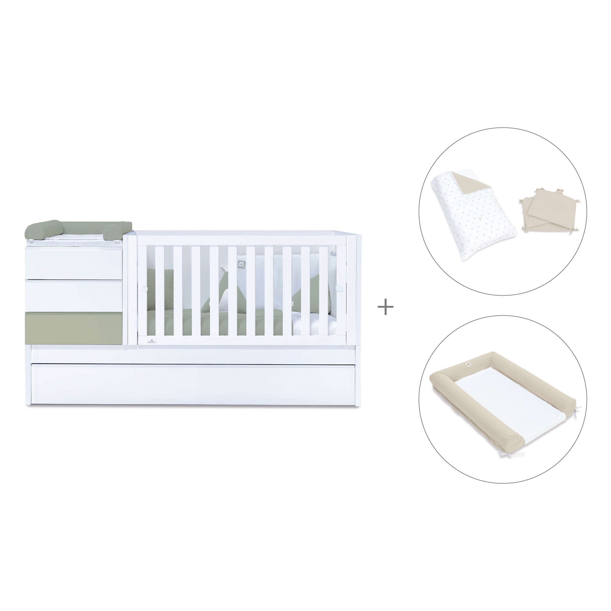 No te pierdas los detalles de esta cuna transformable en cama Sero Kubo de líneas sencillas. Con un estilo atemporal, en acabado lacado en blanco mate y verde-oliva. Como todas nuestras cunas convertibles, se adapta a las diferentes etapas de crecimiento del bebé y está disponible en varias combinaciones y packs textiles, para que elijas la combinación que más se amolde a tus gustos.