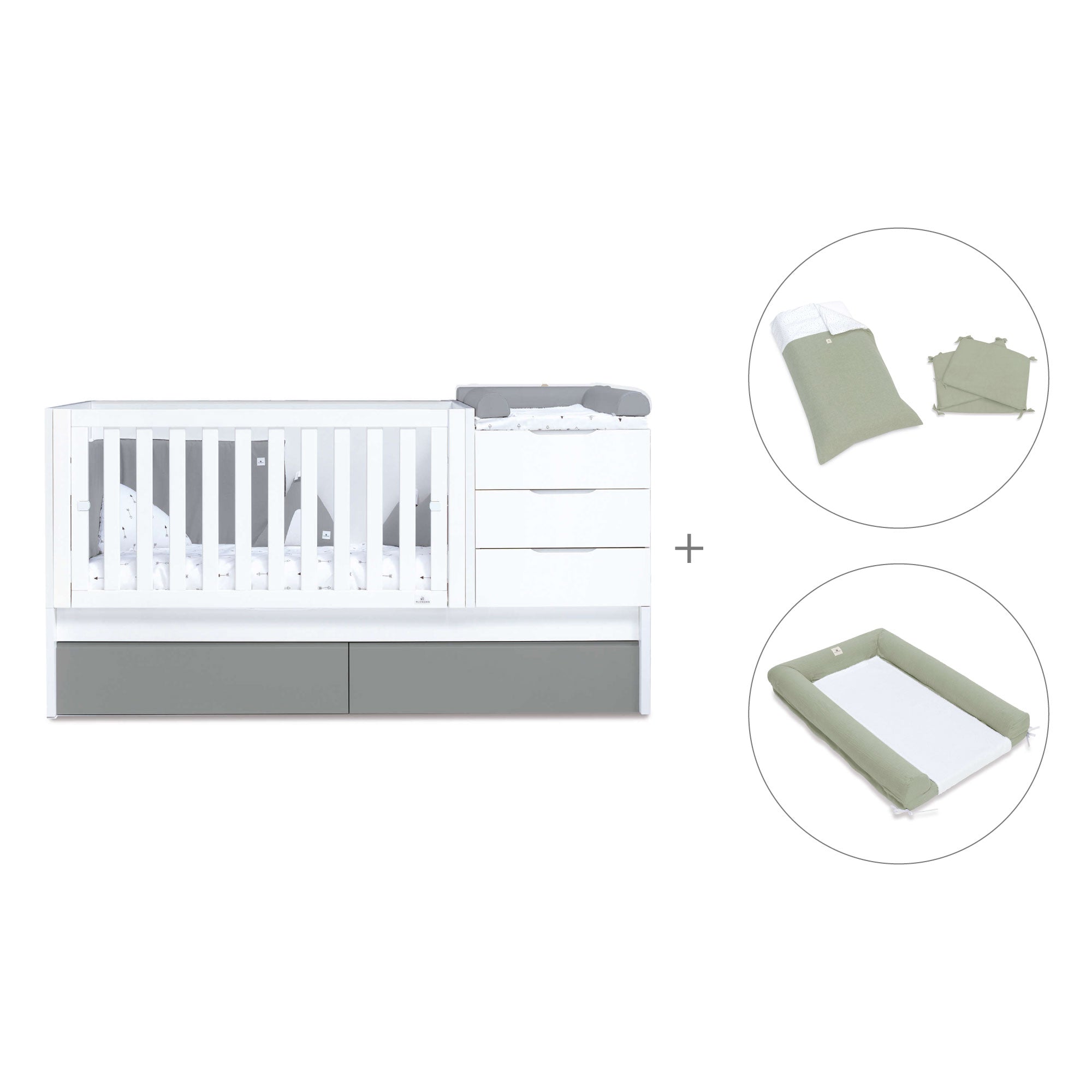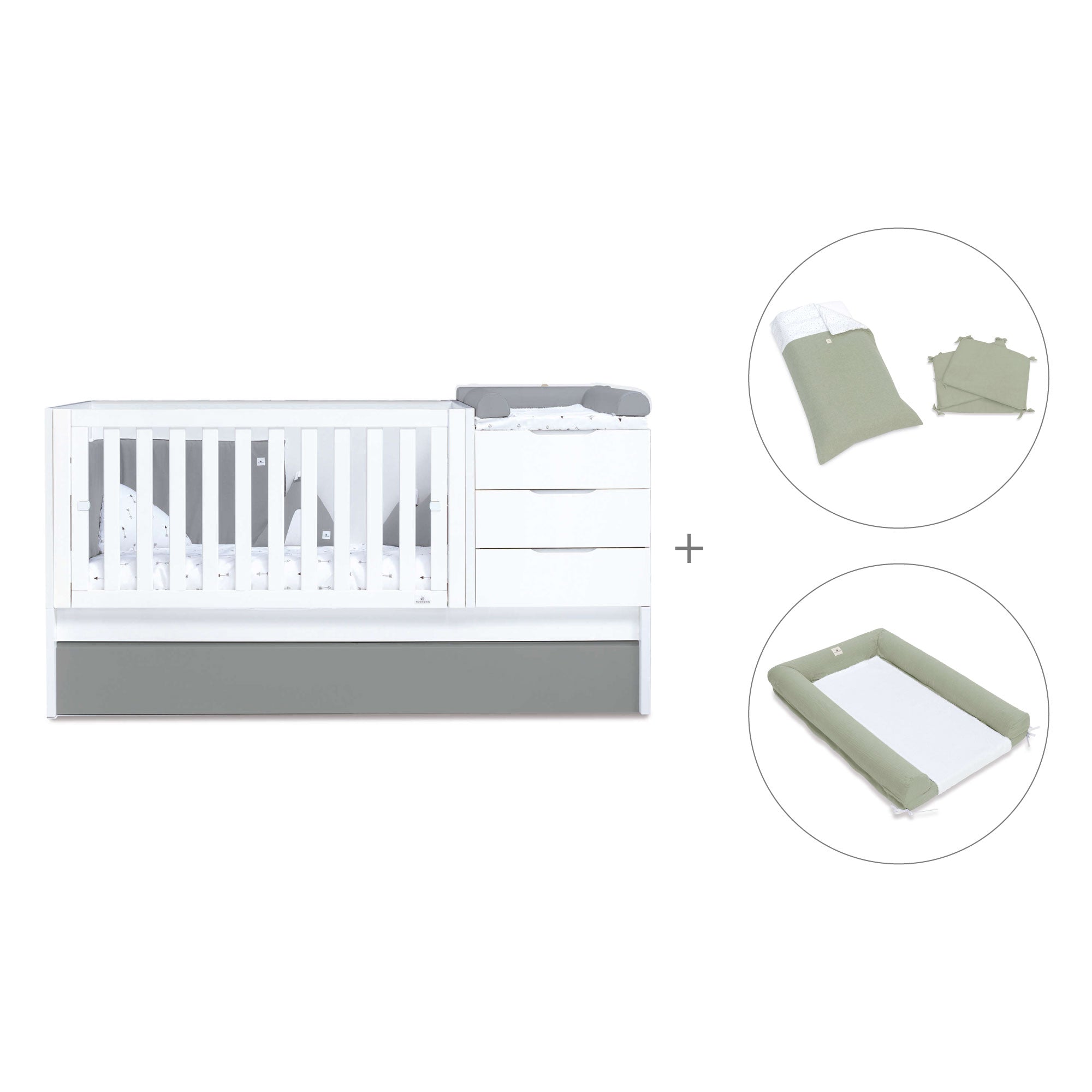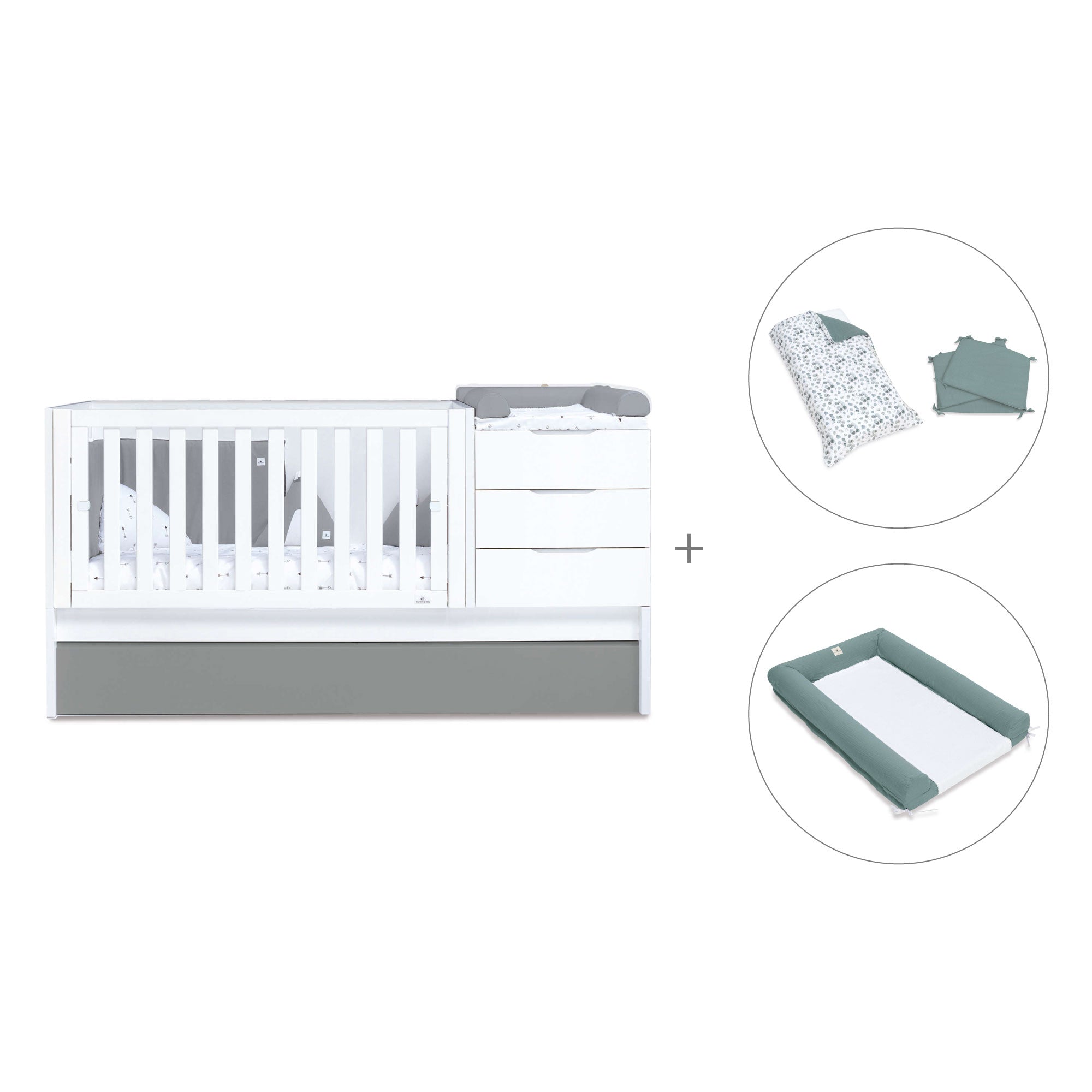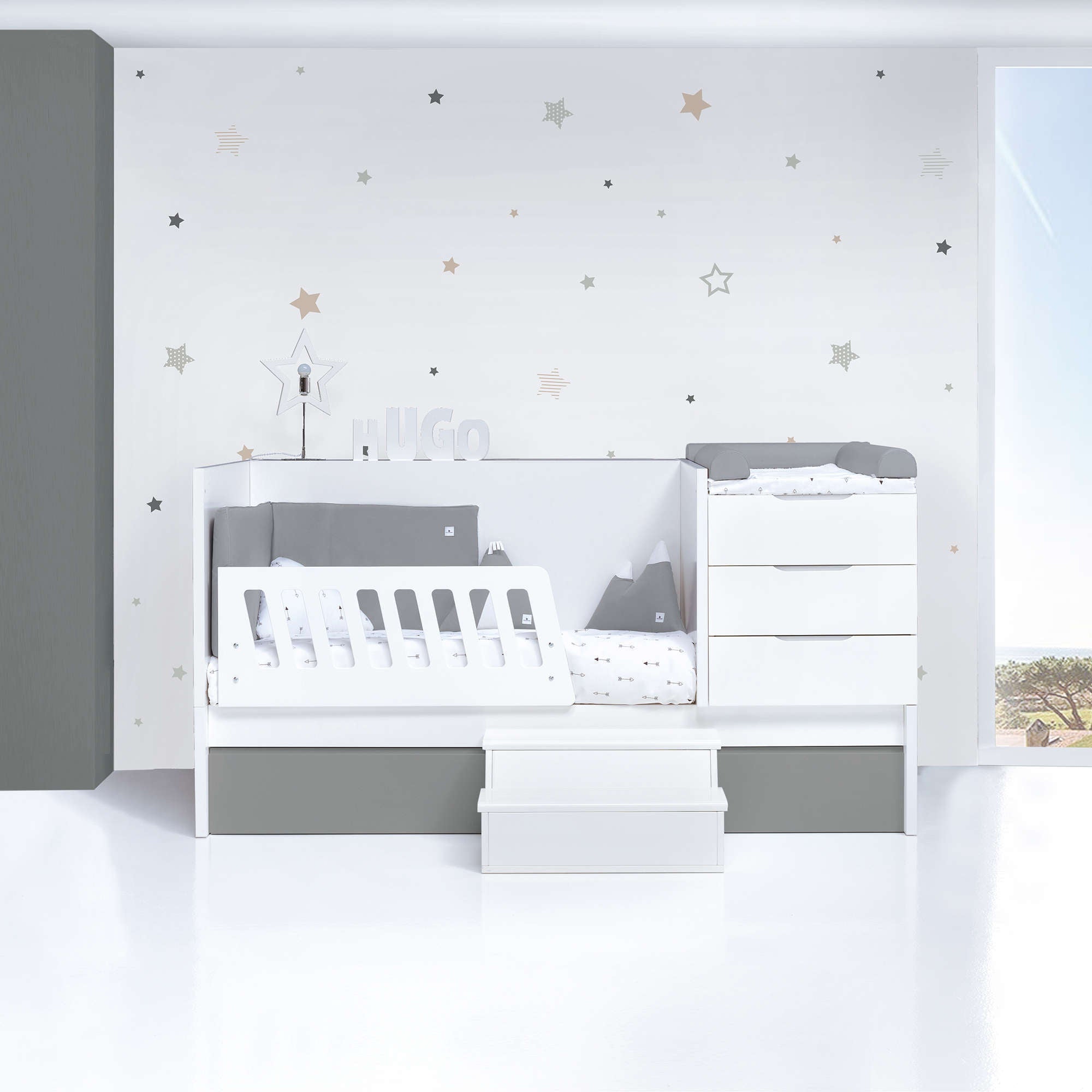 Olvídate de amueblar la habitación infantil de tu bebé cuando crezca. Con esta cuna todo en uno con cambiador tendrás todo lo que necesitas desde su nacimiento hasta su adolescencia. Se trata de un mueble compacto que incluye: cuna 70x140 cm, zona cambiador, estanterías, cajonera y cama nido inferior o cajones (a elegir). Montada como cuna se podrás utilizar desde los 6 meses hasta los 3 años. Pasado este tiempo, se podrá desmontar y convertir en una habitación infantil-juvenil completa con cama júnior de 90x200 cm, escritorio, mesita y book estantería. ¿No te parece práctica? Además, si quieres que la transición de la cuna a la cama sea más fácil, se puedes adquirir varios accesorios opcionales y obtener una etapa intermedia y transformar la cuna en una camita infantil compacta.