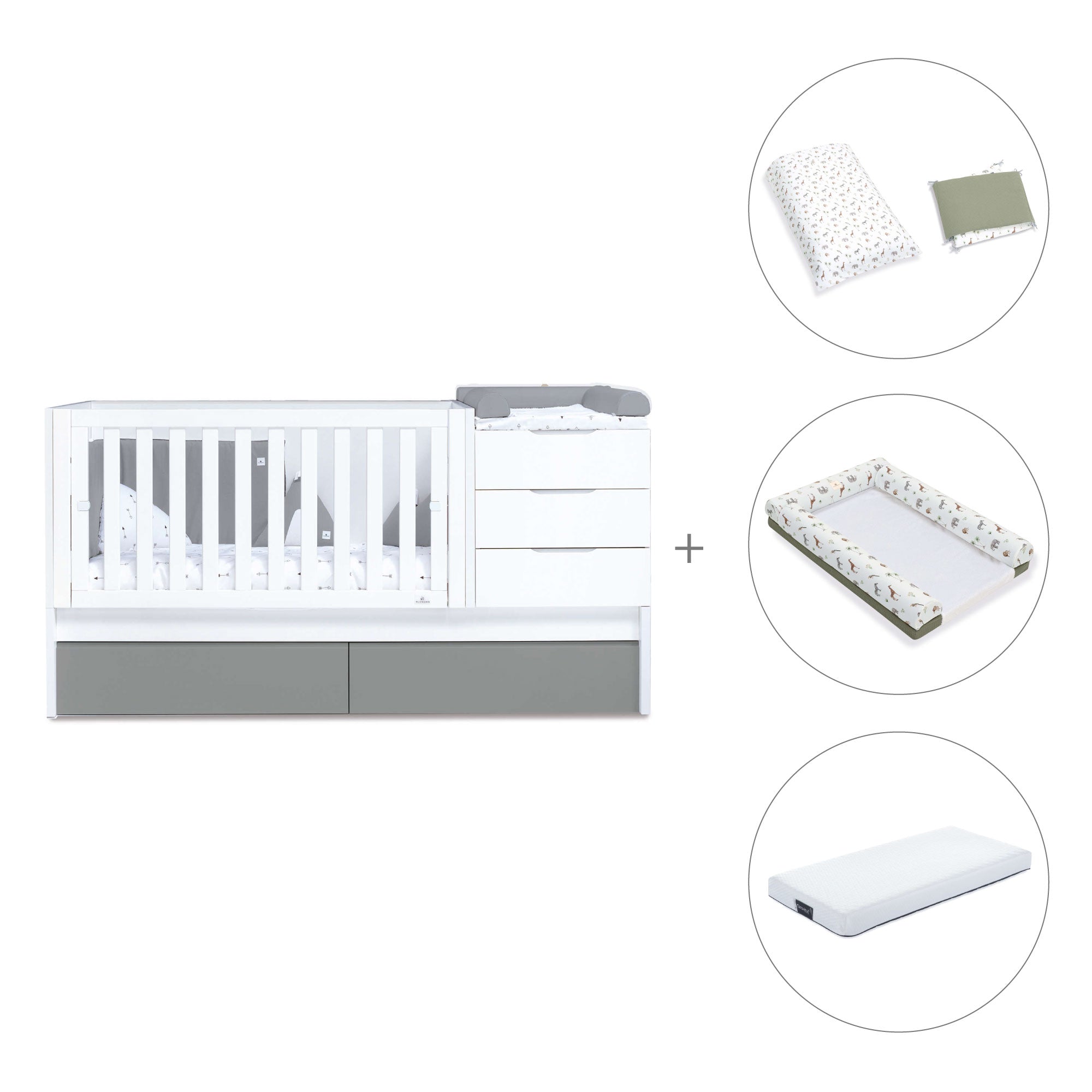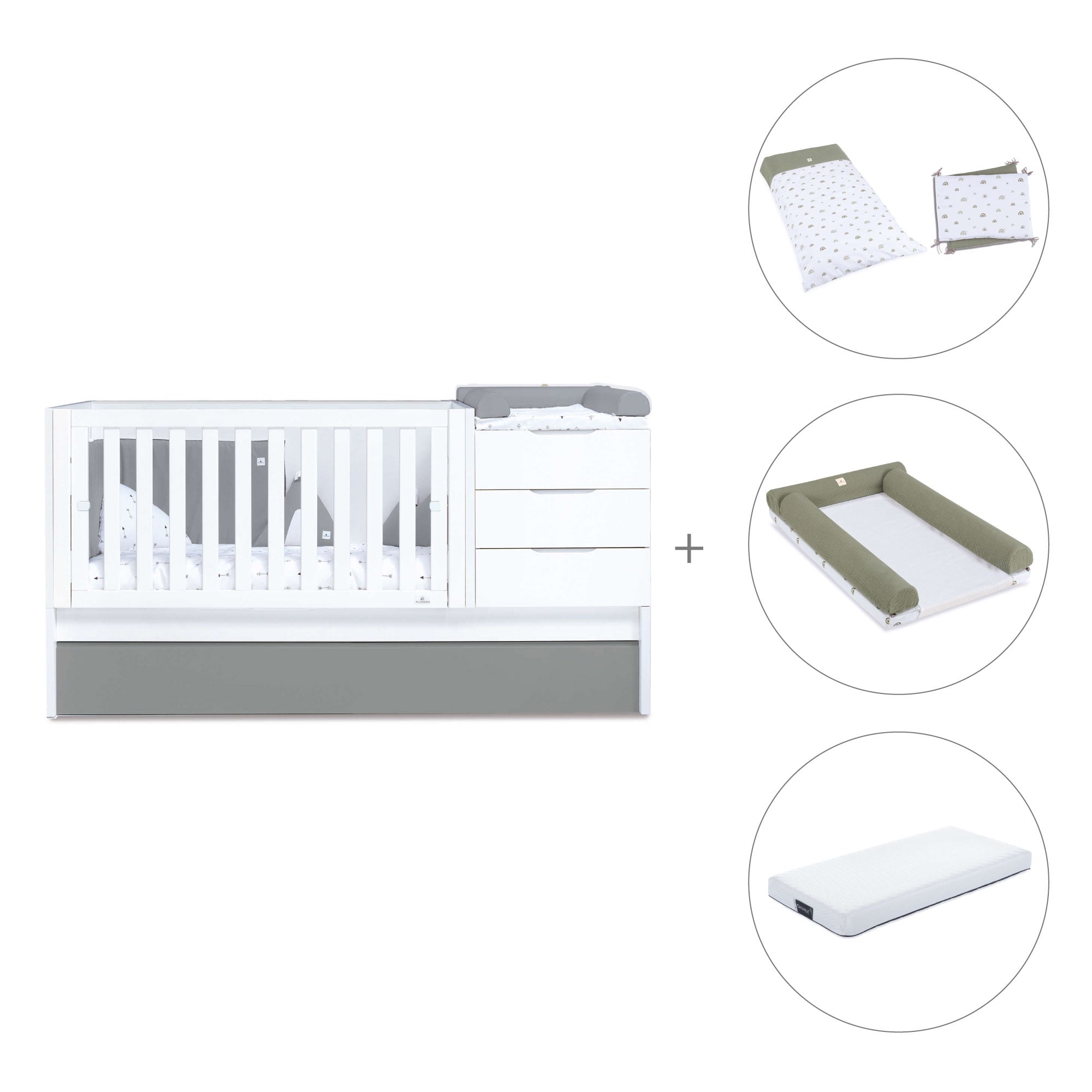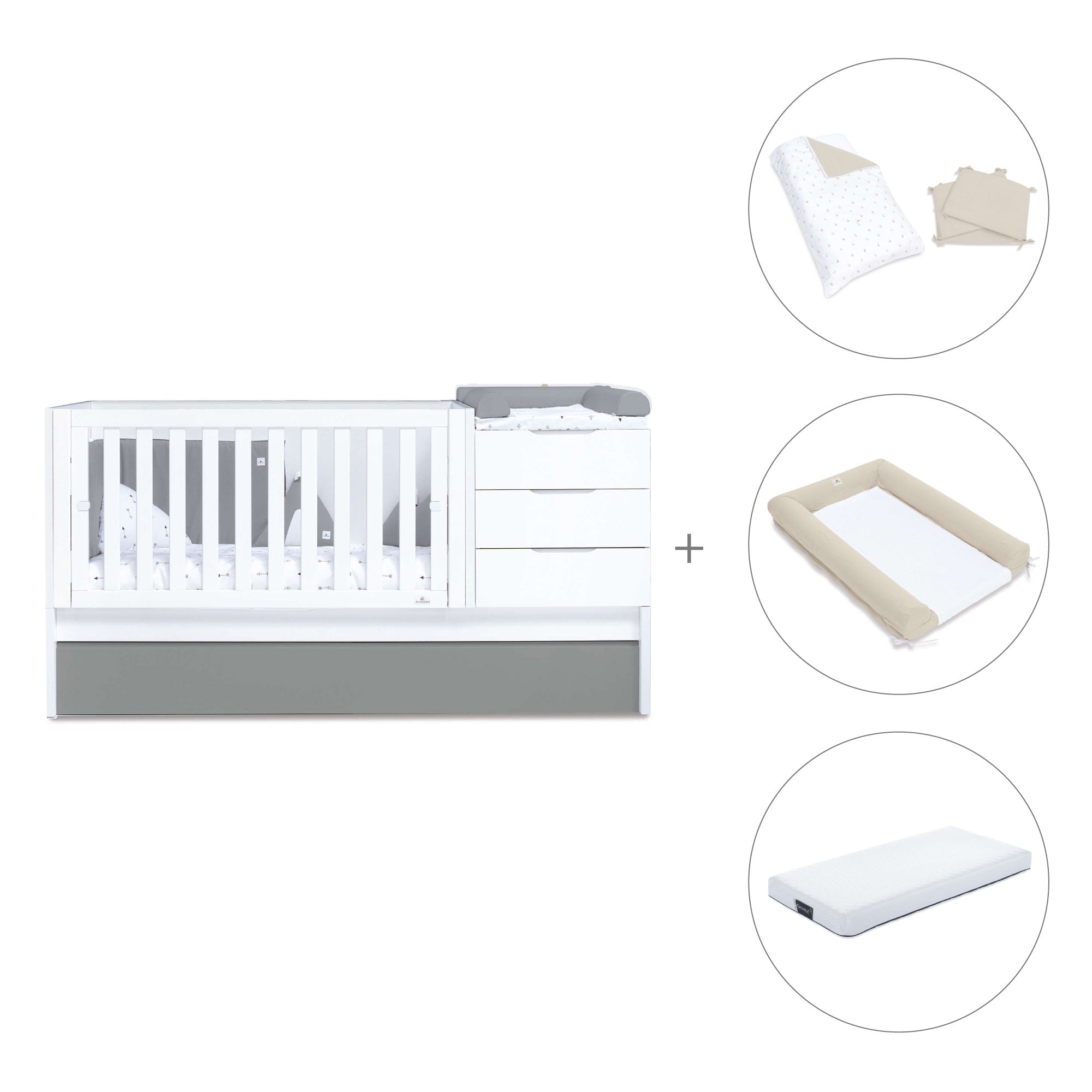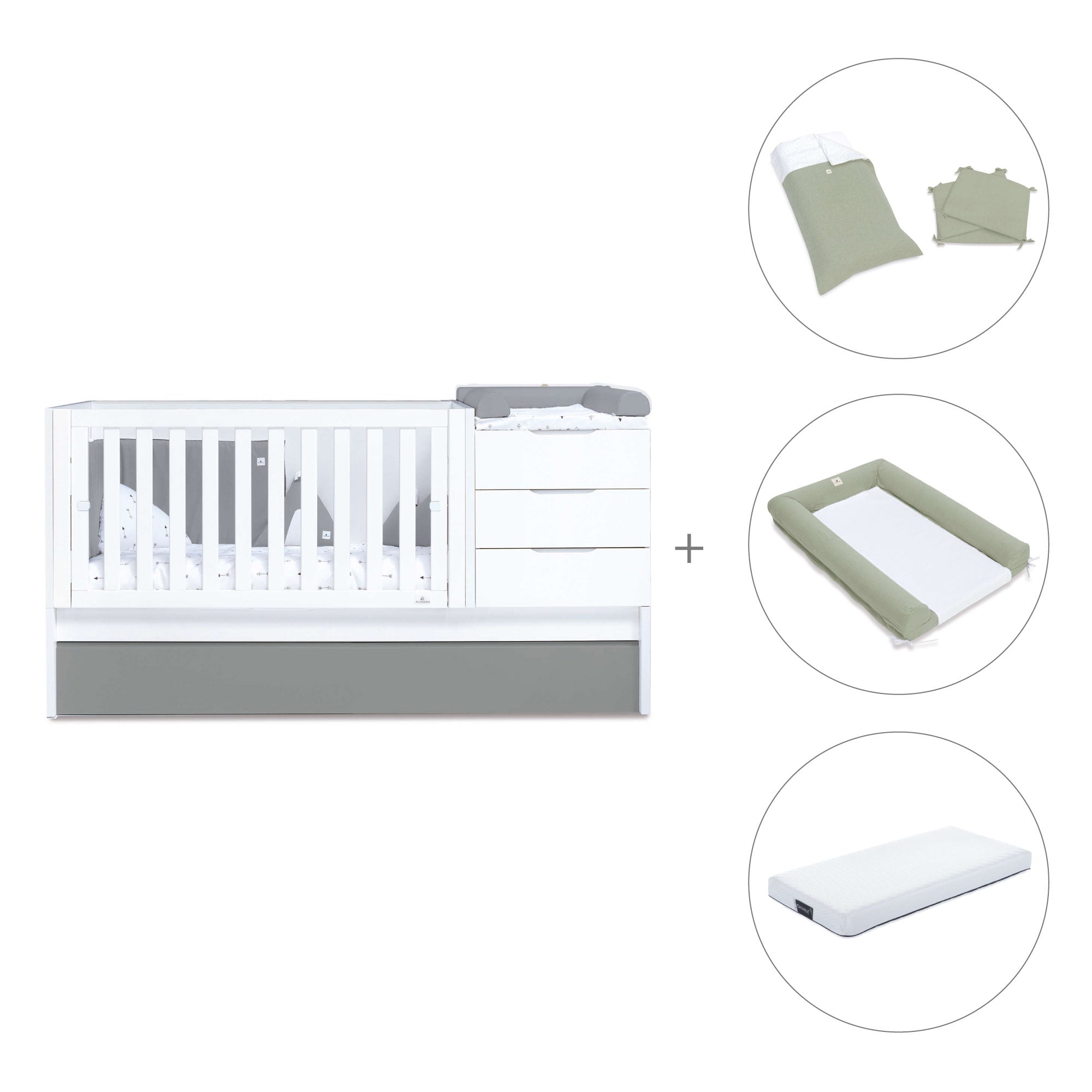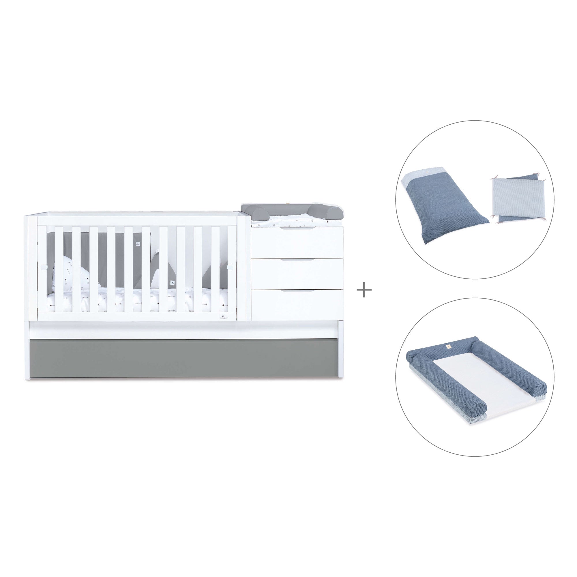 Olvídate de amueblar la habitación infantil de tu bebé cuando crezca. Con esta cuna todo en uno con cambiador tendrás todo lo que necesitas desde su nacimiento hasta su adolescencia. Se trata de un mueble compacto que incluye: cuna 70x140 cm, zona cambiador, estanterías, cajonera y cama nido inferior o cajones (a elegir). Montada como cuna se podrás utilizar desde los 6 meses hasta los 3 años. Pasado este tiempo, se podrá desmontar y convertir en una habitación infantil-juvenil completa con cama júnior de 90x200 cm, escritorio, mesita y book estantería. ¿No te parece práctica? Además, si quieres que la transición de la cuna a la cama sea más fácil, se puedes adquirir varios accesorios opcionales y obtener una etapa intermedia y transformar la cuna en una camita infantil compacta.