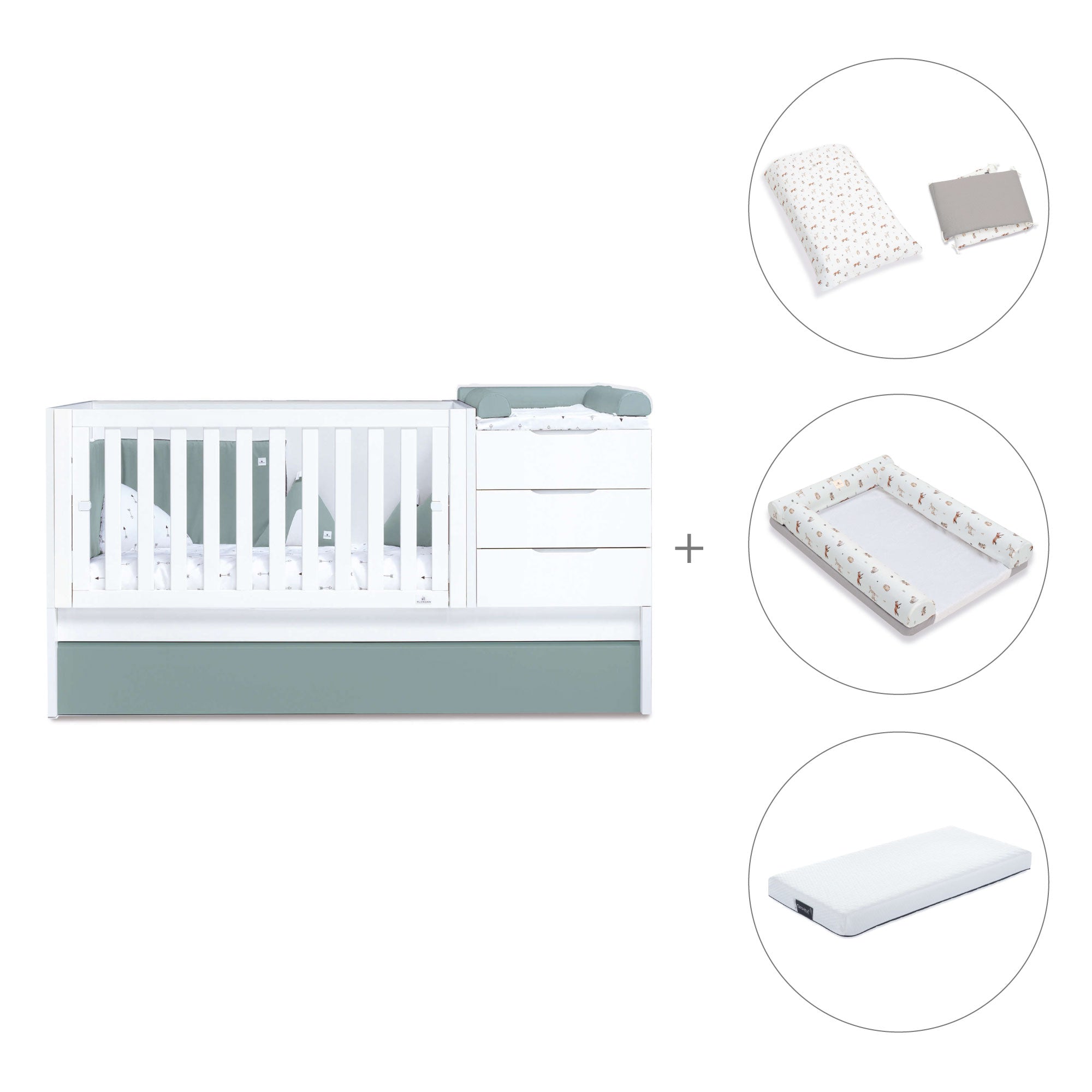 ¿Todavía no sabes lo que es una cuna convertible bebé? ¡No sabes lo que te pierdes! Este tipo de cunas para bebé se caracteriza por ser un mueble compacto todo en uno, con todo lo necesario para amueblar la habitación del bebé. En él tendrás: cuna de medidas 70x140 cm, zona cambiador (para cambiador de 60x90 cm), varias estanterías en el lateral y en la parte superior trasera, cajones y cama nido o cajones inferiores (a elegir). Es ideal para ahorrar en espacio y disponer de todo a mano. Tras su uso como cuna (de 0 a 3 años), la podrás desmontar y transformar es un bonito cuarto infantil-juvenil con una cama juvenil de 90x200 cm, mesita de 3 cajones, book estantería con ruedas y escritorio infantil. ¡Una solución de largo recorrido!