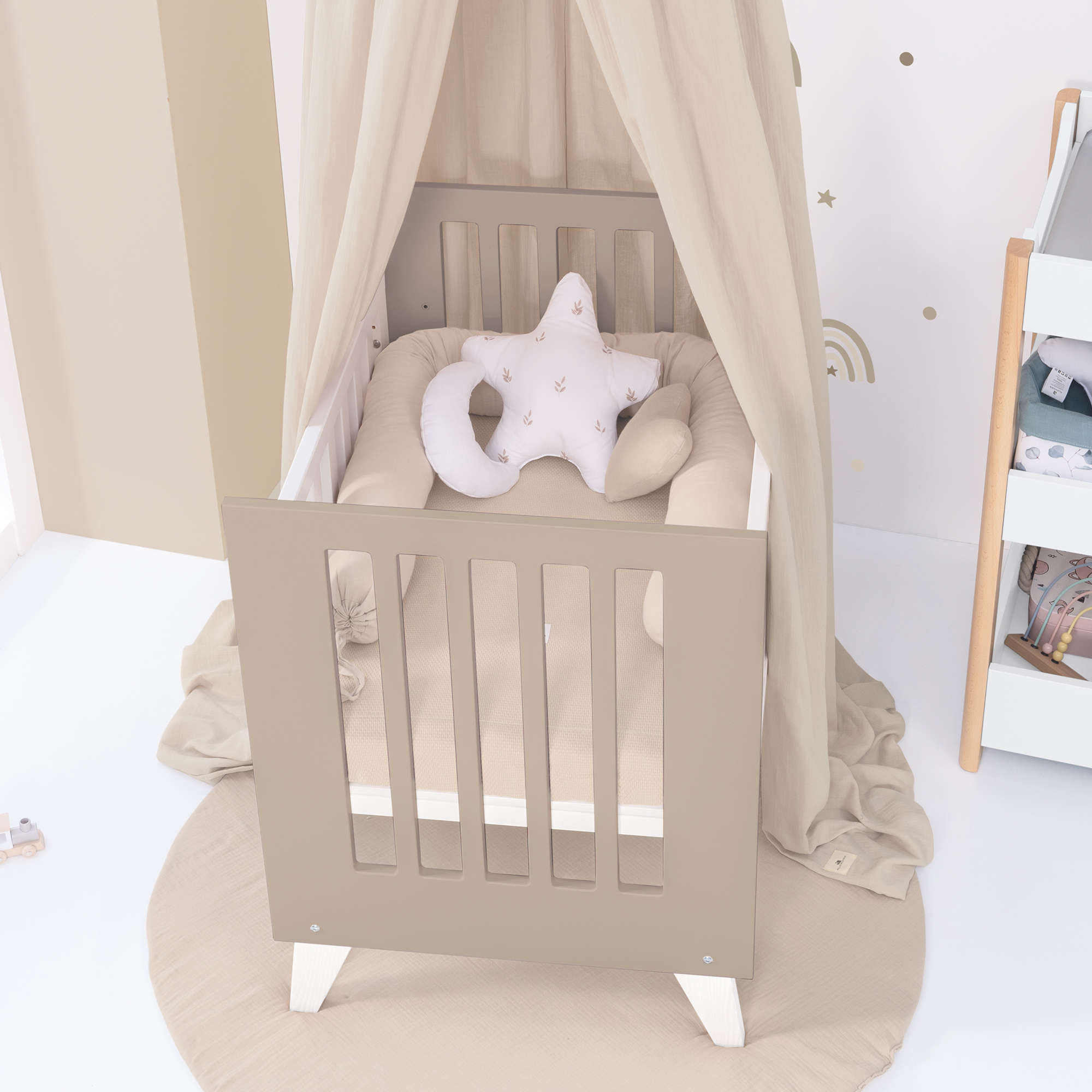 • La barandilla de la minicuna se puede ajustar a 3 alturas, de la parte superior del colchón de la cama de los padres para montaje como colecho: 57,5 cm - 63,9 cm - 70,3 cm.