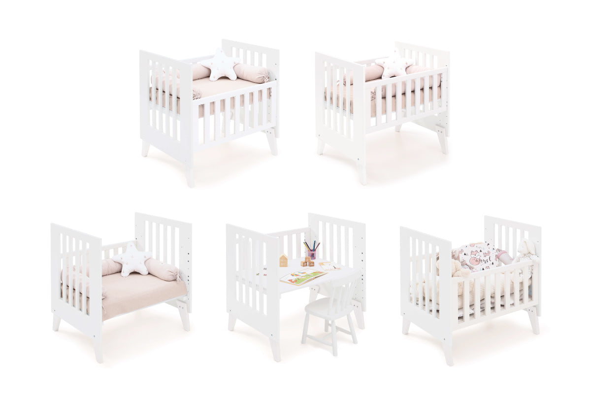 - Convertible en 5 etapas sin necesidad de elementos adicionales: Minicuna de colecho - Minicuna - Sofá infantil - Escritorio - Juguetero.