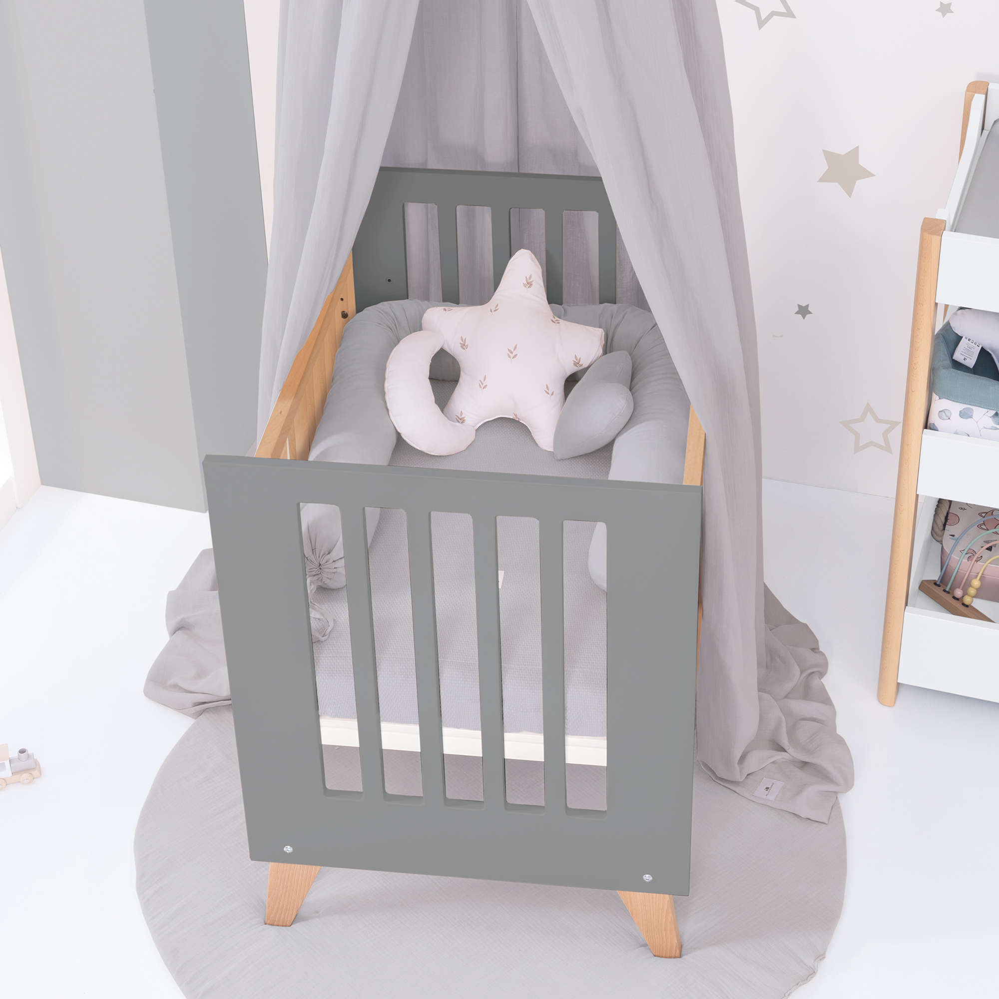 Con esta minicuna de colecho en madera y gris antracita (60x80 cm) podrás practicar colecho seguro con tu bebé en la cama de matrimonio. Gracias a sus lateral abatible, a su somier regulable en altura y al sistema de sujeción que incluye, la minicuna quedará alineada y segura. No incluye ruedas, pero se puede trasladar por la casa con facilidad, ya que es muy ligera. Su combinación de colores aportará elegancia y calidez.
