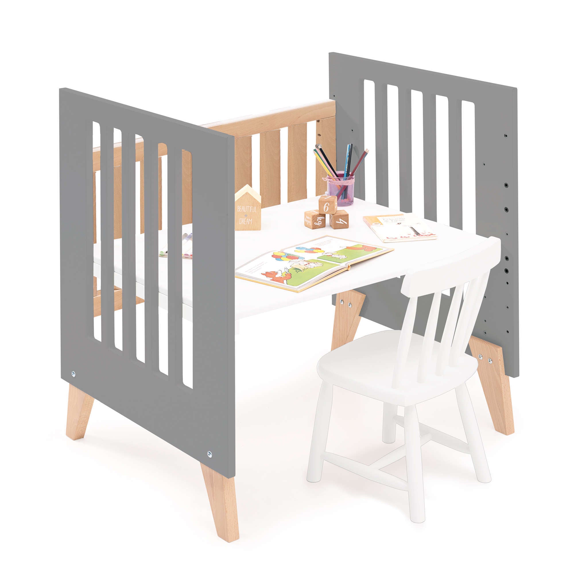 - Convertible en 5 etapas sin necesidad de elementos adicionales: Minicuna de colecho - Minicuna - Sofá infantil - Escritorio - Juguetero.