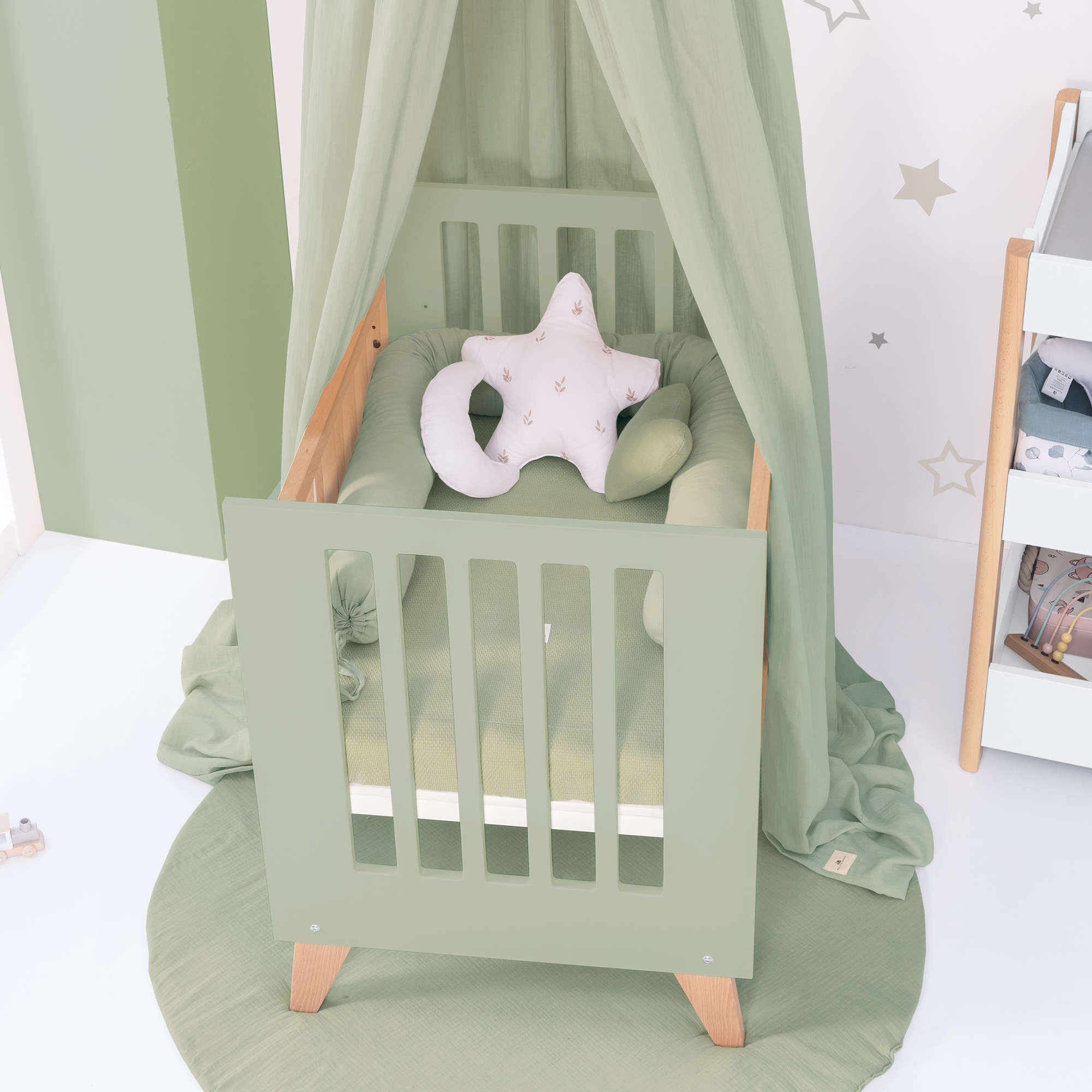 Esta minicuna colecho madera 60x80 cm la podrás usar para bebés recién nacidos hasta los 6 meses aproximadamente. Combina el color verde-oliva de los cabeceros con la calidez de la madera de las barandillas y de las patas. Simplemente bajando una de las barandilla, podrás colocar la minicuna pegada a la cama y practicar colecho seguro con el bebé. Dispone de 3 alturas de somier (montada como colecho) para poder regularla a la altura de la cama de matrimonio. Además, para poder darle más de un uso, se puede convertir en sofá infantil, pupitre o en juguetero para guardar sus juguetes.