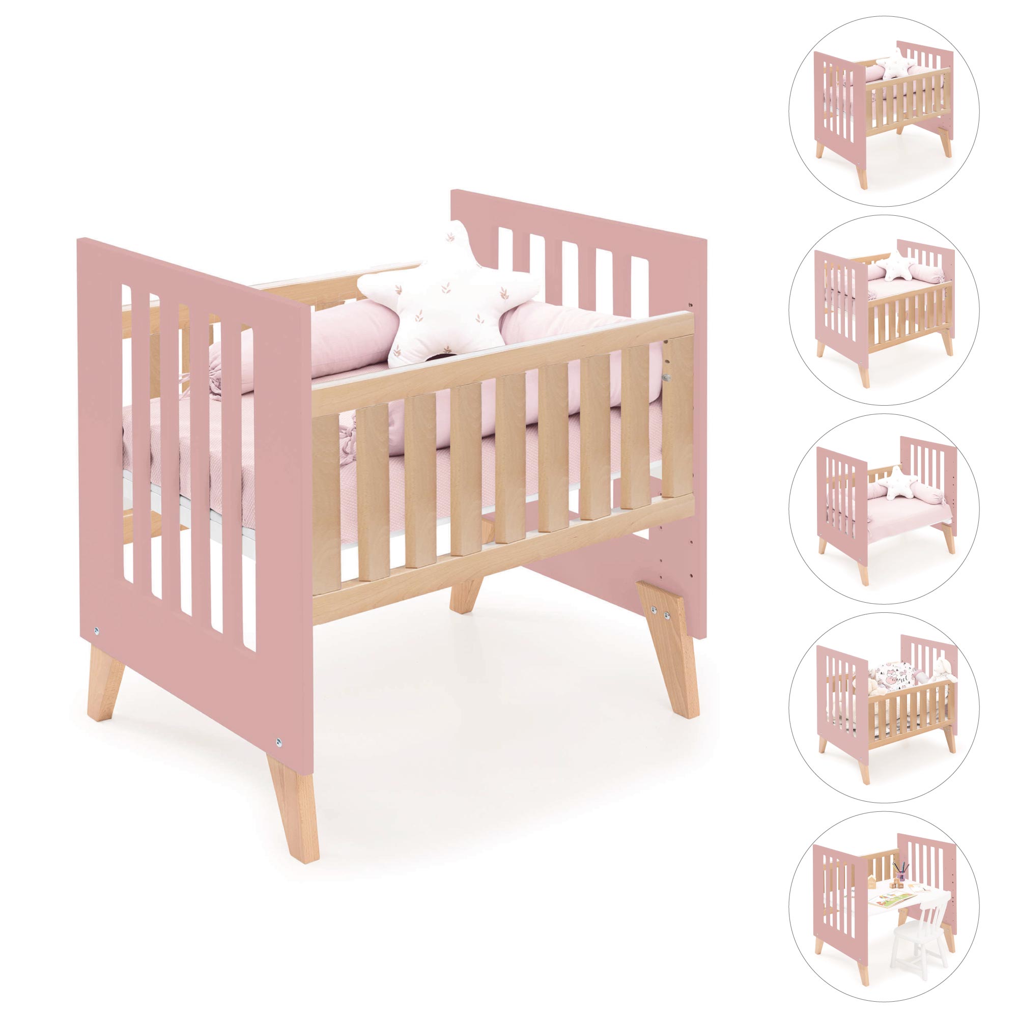 Si te gusta el color rosa, entonces te va a enamorar esta minicuna colecho en madera y rosa 60x80 cm. Una combinación de colores que aportará frescura pero también calidez a cualquier estancia infantil. Con ella, podrás tener a tu recién nacido muy cerca de ti durante la noche, pegando la minicuna a la cama de matrimonio para el colecho. De esta manera, facilitará las tomas nocturnas y el no tener que levantarse para cogerlo. Una vez se deje de usar la minicuna por que el bebé ya no cabe en ella, se puede convertir en sofá, pupitre o juguetero.