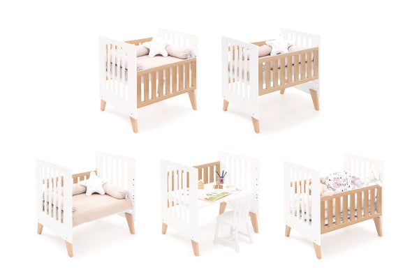 - Convertible en 5 etapas sin necesidad de elementos adicionales: Minicuna de colecho - Minicuna - Sofá infantil - Escritorio - Juguetero.