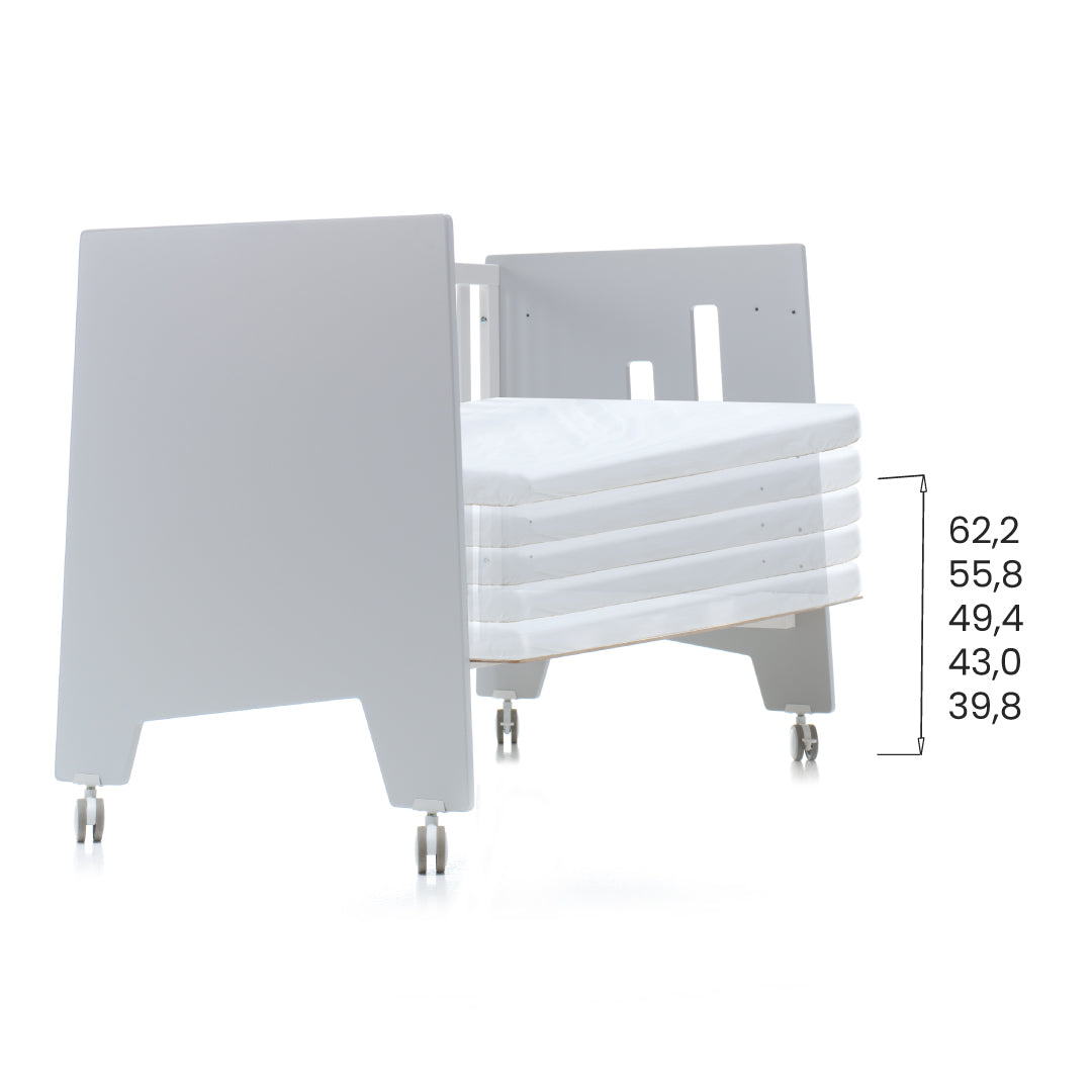 • El somier de la cuna se puede ajustar a 5 alturas (con ruedas): 27,8 cm - 31,0 cm - 37,4 cm - 43,8 cm - 50,2 cm (sin colchón); o 39,8 cm - 43,0 cm - 49,4 cm - 55,8 cm - 62,2 cm (con colchón).