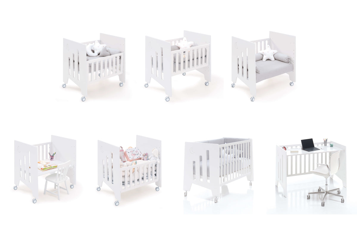 • Convertible en 7 etapas sin necesidad de elementos adicionales: Minicuna de colecho 60x80 cm- Minicuna 60x80 cm - Sofá infantil - Pupitre - Juguetero - Cuna 60x120 cm - Escritorio infantil.