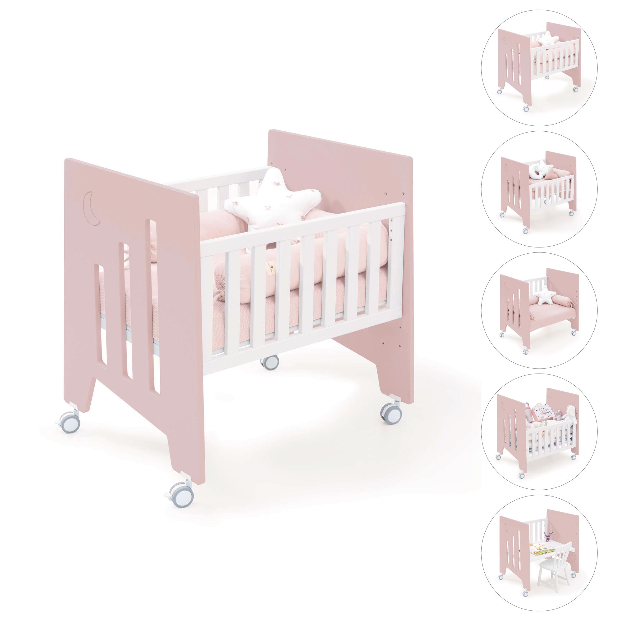- Convertible en 5 etapas sin necesidad de elementos adicionales: Minicuna de colecho - Minicuna - Sofá infantil - Escritorio - Juguetero.